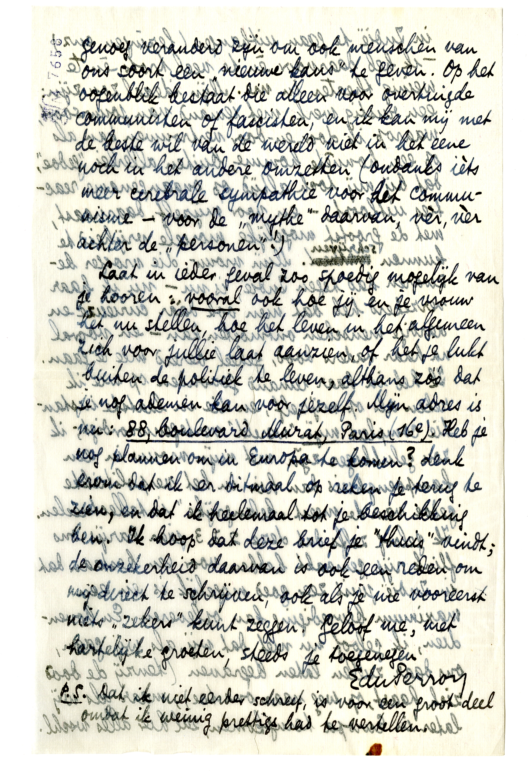 Laat in ieder geval zoo spoedig mogelijk van je hooren: vooral ook hoe jij en je vrouw het nu stellen, hoe het leven in het algemeen zich voor jullie laat aanzien, of het je lukt buiten de politiek te leven, althans zóó dat je nog ademen kan voor jezelf. Mijn adres is nu: 88, boulevard Murat, Paris (16e). Heb je nog plannen om in Europa te komen? denk erom dat ik er ditmaal op reken je terug te zien, en dat ik heelemaal tot je beschikking ben. Ik hoop dat deze briefje ‘thuis’ vindt; de onzekerheid daarvan is ook een reden om mij direct te schrijven, ook als je me vooreerst niets ‘zekers’ kunt zeggen. Geloof me, met hartelijke groeten, steeds je toegenegen