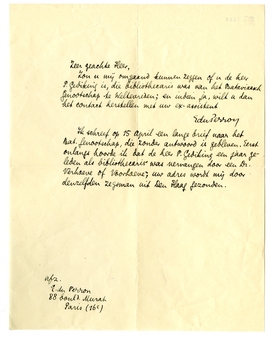 Ik schreef op 15 April een lange brief naar het Bat. Genootschap, die zonder antwoord is gebleven. Eerst onlangs hoorde ik dat de heer P. Gediking een jaar geleden als bibliothecaris was vervangen door een Dr. Verhoeve of Voorhoeve7482; uw adres wordt mij door denzelfden zegsman uit Den Haag gezonden.