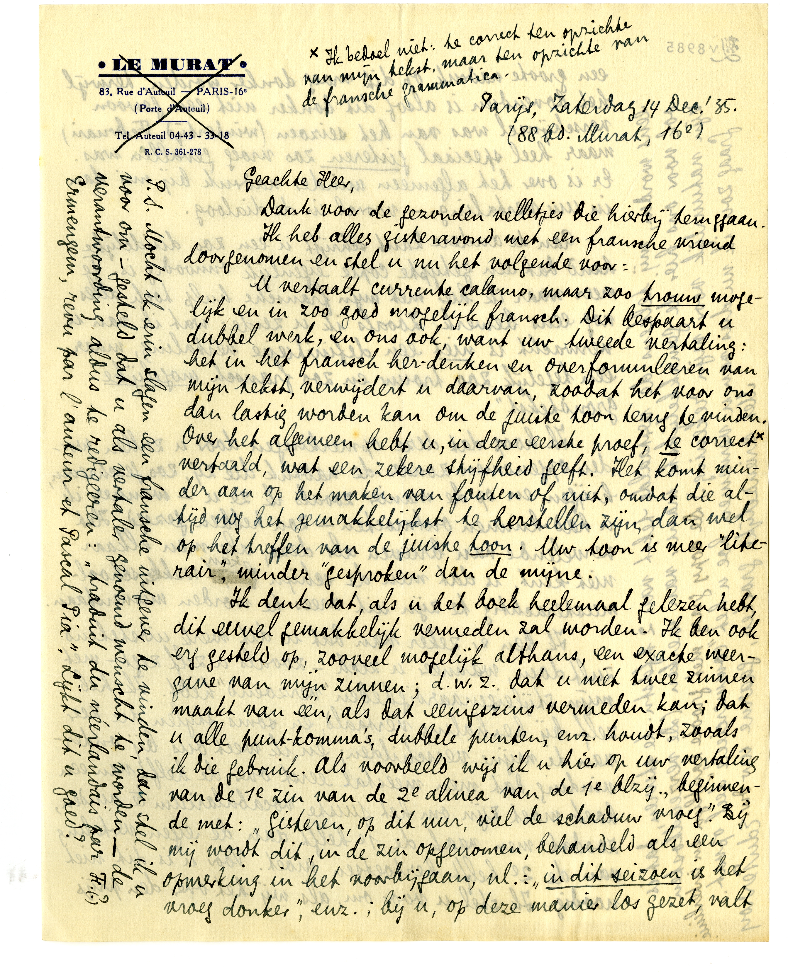 U vertaalt currente calamo,7550 maar zoo trouw mogelijk en in zoo goed mogelijk fransch. Dit bespaart u dubbel werk, en ons ook, want uw tweede vertaling: er-denken en over-formuleeren van mijn tekst, verwijdert u daarvan, zoodat het voor ons dan lastig worden kan om de juiste toon terug te vinden. Over het algemeen hebt u, in deze eerste proef, te correct* vertaald, wat een zekere stijfheid geeft. Het komt minder aan op het maken van fouten of niet, omdat die altijd nog het gemakkelijkst te herstellen zijn, dan wel op het treffen van de juiste toon. Uw toon is meer ‘literair’, minder ‘gesproken’ dan de mijne.
