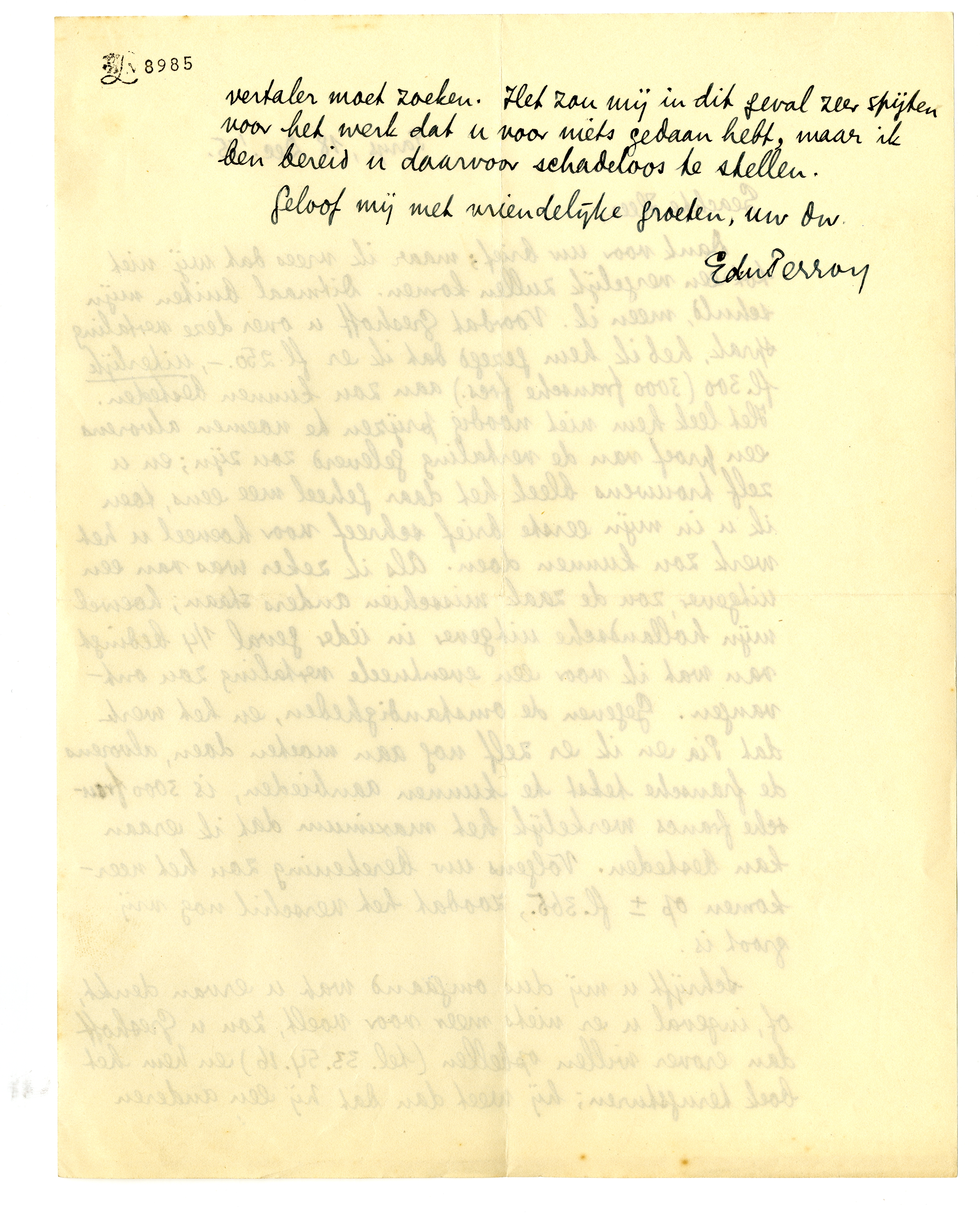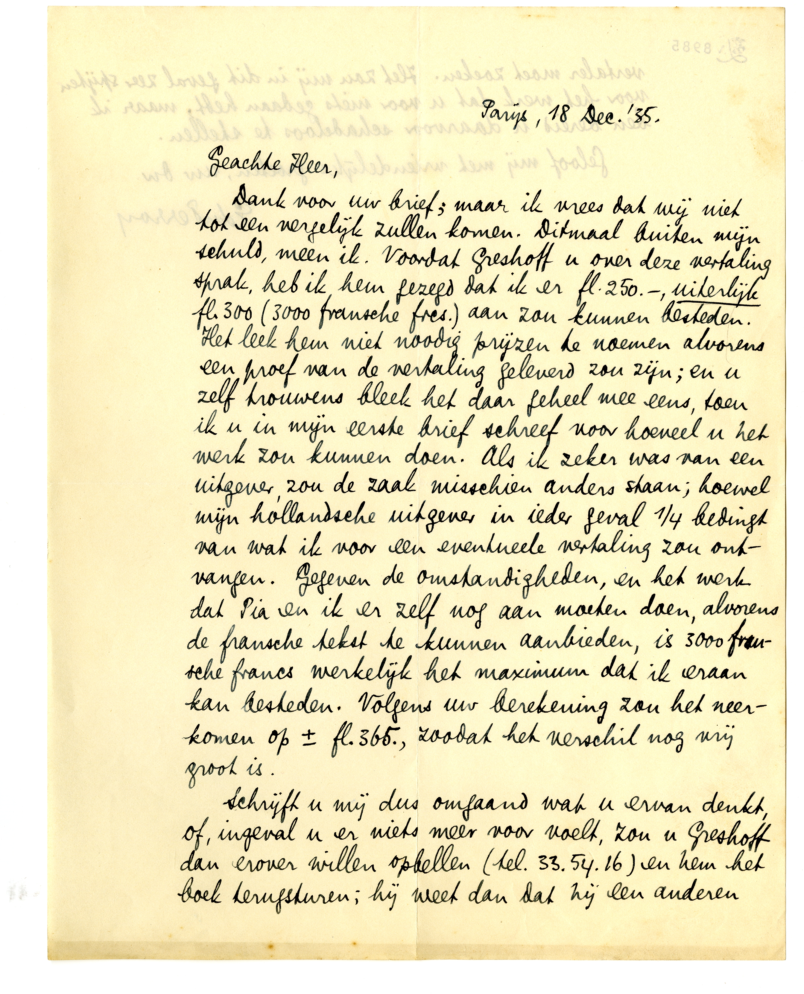Dank voor uw brief; maar ik vrees dat wij niet tot een vergelijk zullen komen. Ditmaal buiten mijn schuld, meen ik. Voordat Greshoff u over deze vertaling sprak, heb ik hem gezegd dat ik er fl. 250. -, uiterlijk fl. 300 (3000 fransche frcs.) aan zou kunnen besteden. Het leek hem niet noodig prijzen te noemen alvorens een proef van de vertaling geleverd zou zijn; en u zelf trouwens bleek het daar geheel mee eens, toen ik u in mijn eerste brief schreef voor hoeveel u het werk zou kunnen doen. Als ik zeker was van een uitgever, zou de zaak misschien anders staan; hoewel mijn hollandsche uitgever in ieder geval ¼ bedingt van wat ik voor een eventueele vertaling zou ontvangen. Gegeven de omstandigheden, en het werk dat Pia en ik er zelf nog aan moeten doen, alvorens de fransche tekst te kunnen aanbieden, is 3000 fransche francs werkelijk het maximum dat ik eraan kan besteden. Volgens uw berekening zou het neerkomen op ± fl. 365., zoodat het verschil nog vrij groot is.