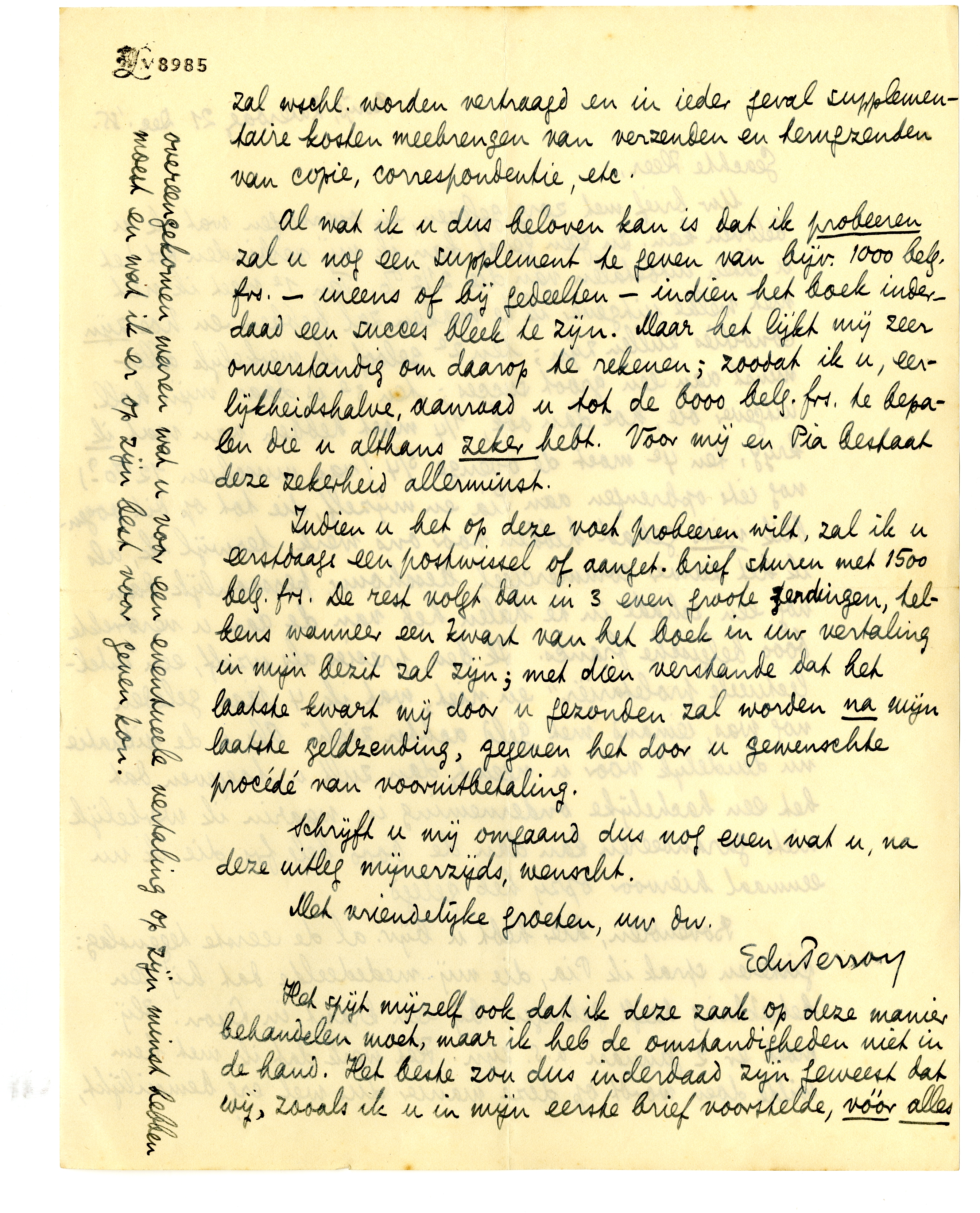 Indien u het op deze voet probeeren wilt, zal ik u eerstdaags een postwissel of aanget. brief sturen met 1500 belg. frs. De rest volgt dan in 3 even groote zendingen, telkens wanneer een kwart van het boek in uw vertaling in mijn bezit zal zijn; met dien verstande dat het laatste kwart mij door u gezonden zal worden na mijn laatste geldzending, gegeven het door u gewenschte procédé van vooruitbetaling.