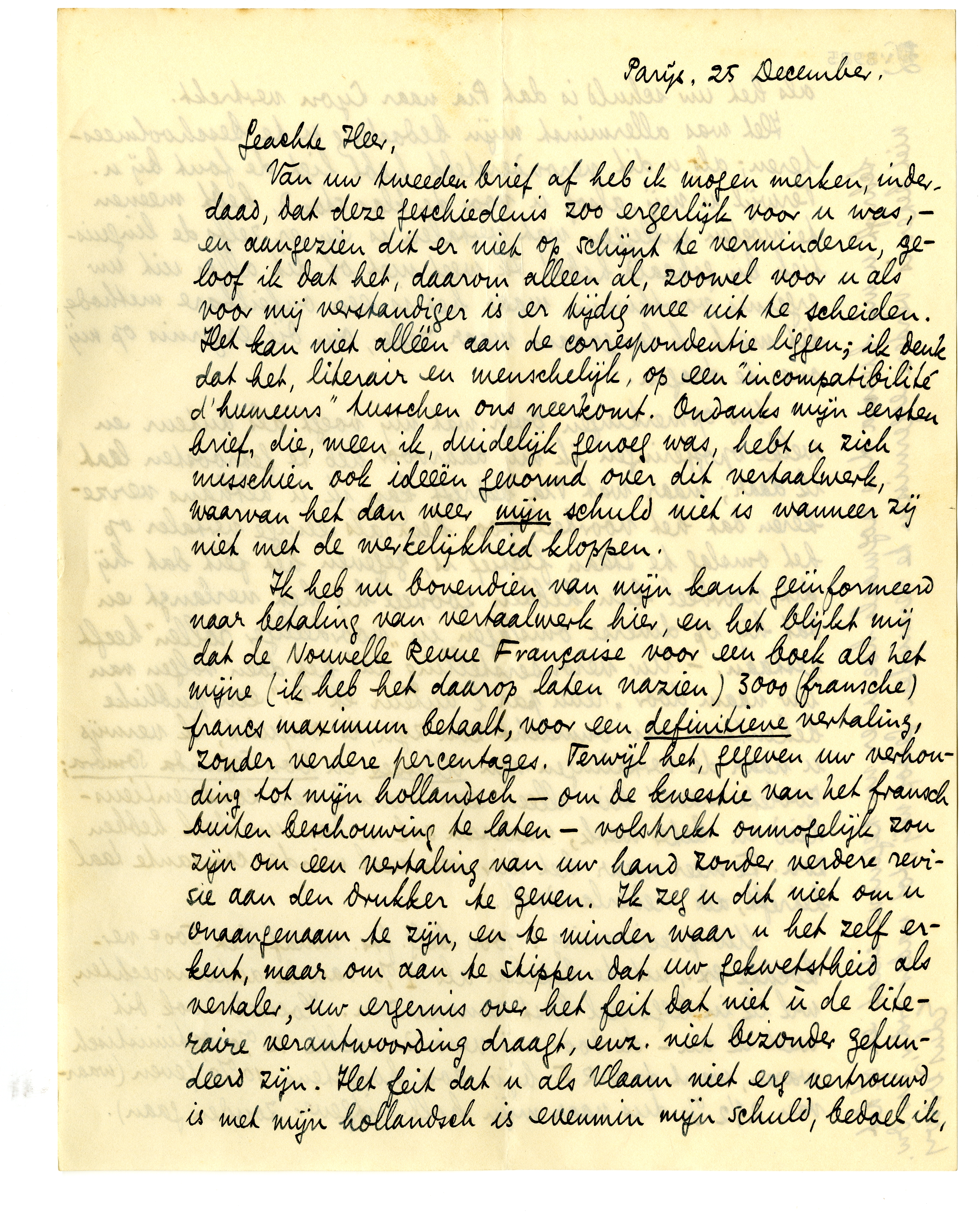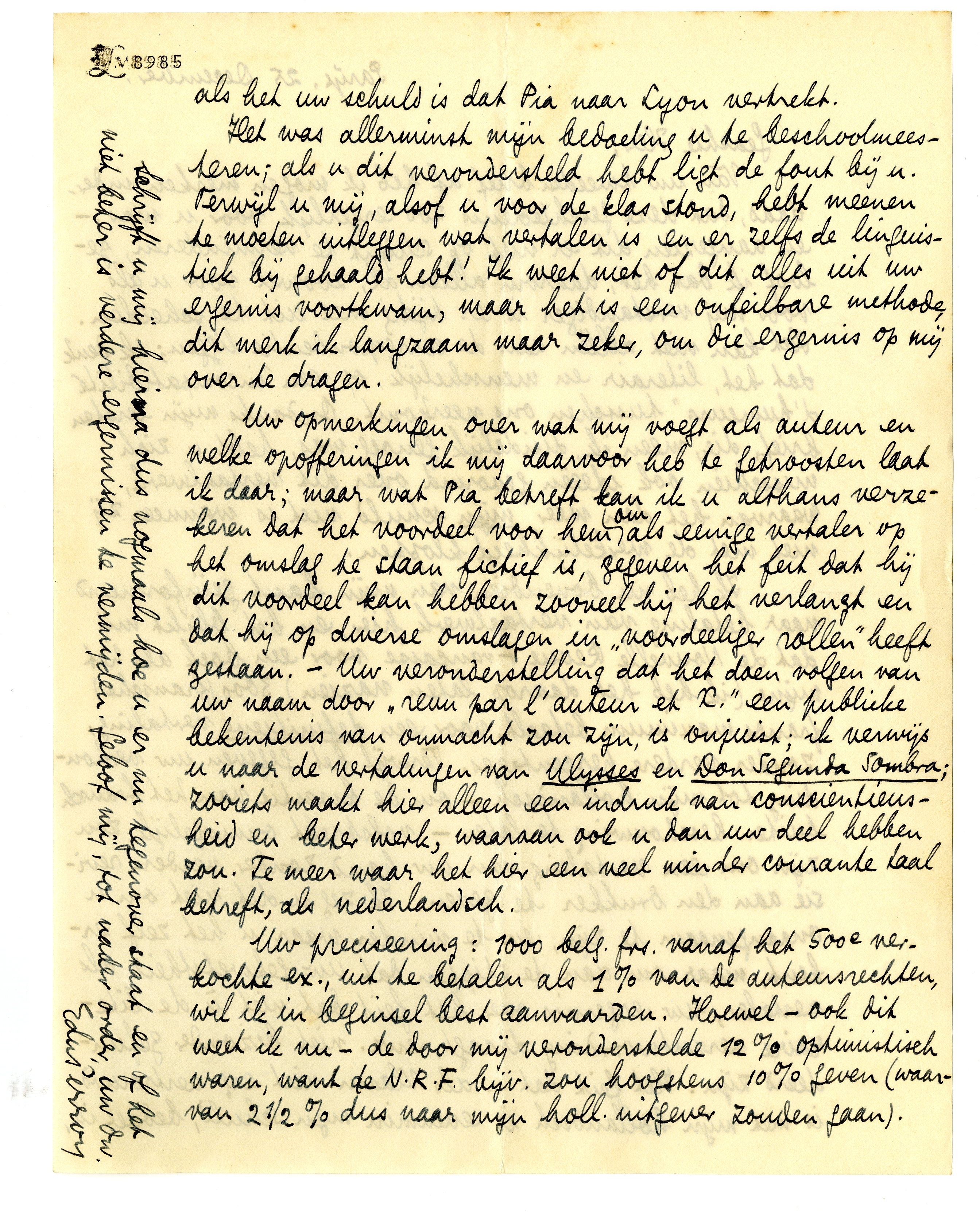 Ik heb nu bovendien van mijn kant geïnformeerd naar betaling van vertaalwerk hier, en het blijkt mij dat de Nouvelle Revue Française voor een boek als het mijne (ik heb het daarop laten nazien) 3000 (fransche) francs maximum betaalt, voor een definitieve vertaling, zonder verdere percentages. Terwijl het, gegeven uw verhouding tot mijn hollandsch7563 - om de kwestie van het fransch buiten beschouwing te laten - volstrekt onmogelijk zou zijn om een vertaling van uw hand zonder verdere revisie aan den drukker te geven. Ik zeg u dit niet om u onaangenaam te zijn, en te minder waar u het zelf erkent, maar om aan te stippen dat uw gekwetstheid als vertaler, uw ergernis over het feit dat niet u de literaire verantwoording draagt, enz. niet bizonder gefundeerd zijn.7564 Het feit dat u als Vlaam niet erg vertrouwd is met mijn hollandsch is evenmin mijn schuld, bedoel ik, als het uw schuld is dat Pia naar Lyon vertrekt.