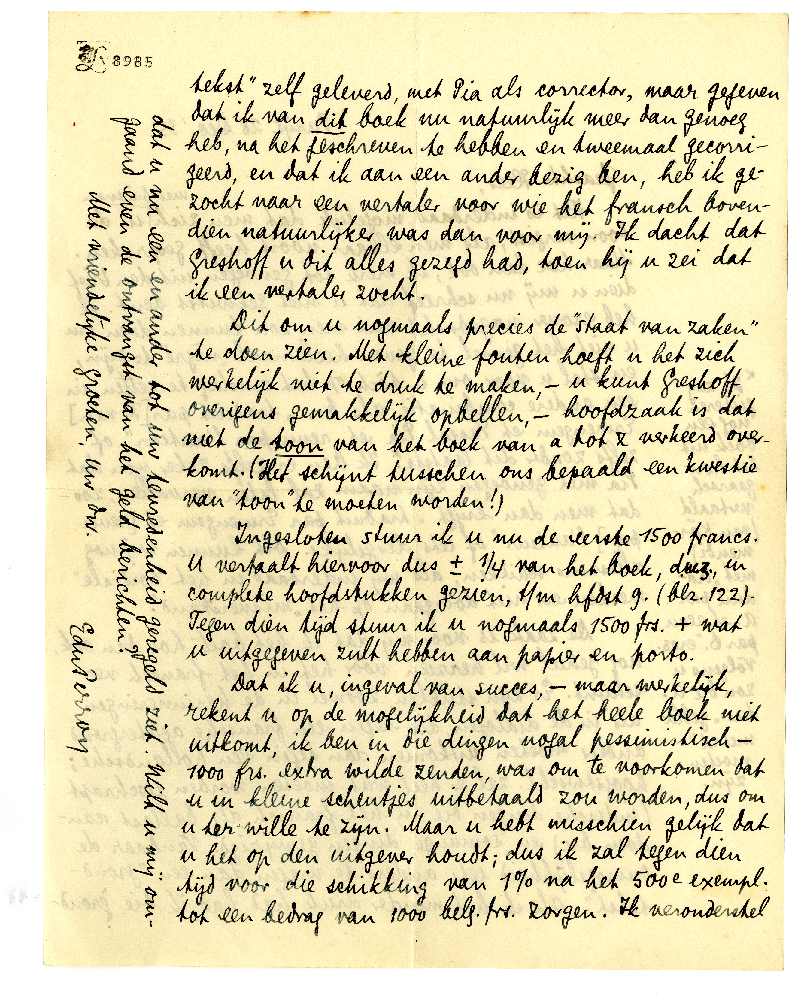 Ingesloten stuur ik u nu de eerste 1500 francs. U vertaalt hiervoor dus ±¼ van het boek, d.w.z., in complete hoofdstukken gezien, t/m hfdst 9. (blz. 122). Tegen dien tijd stuur ik u nogmaals 1500 frs. + wat u uitgegeven zult hebben aan papier en porto.