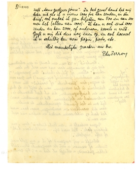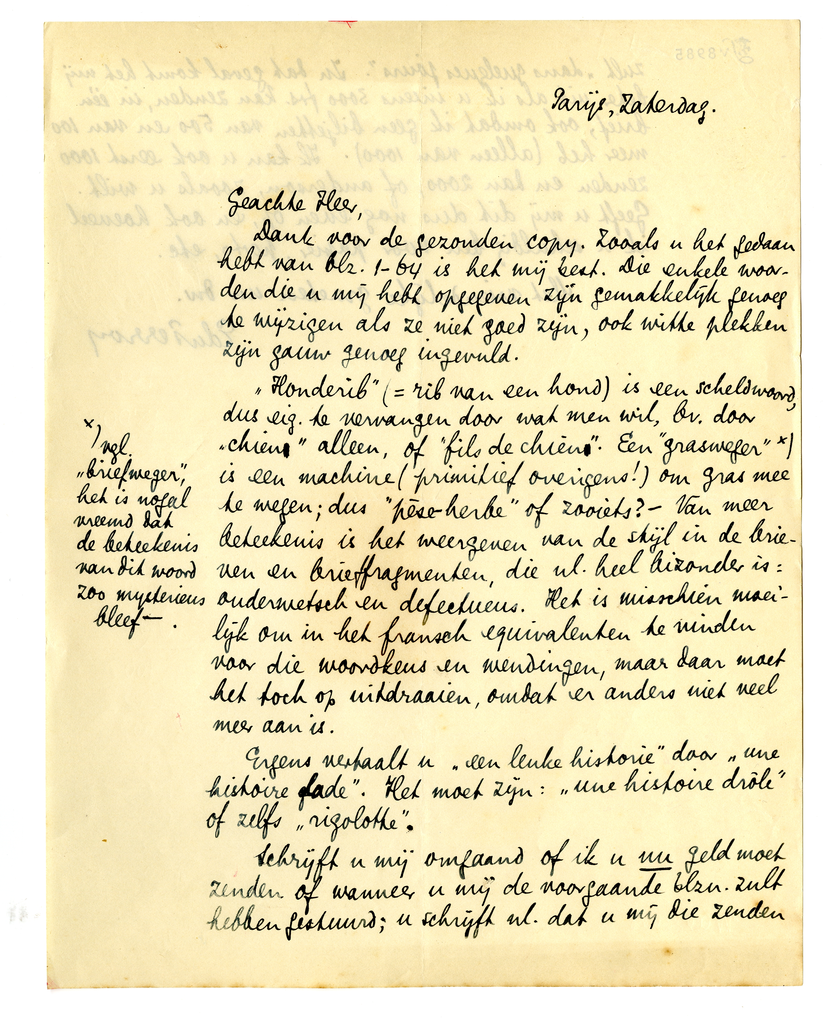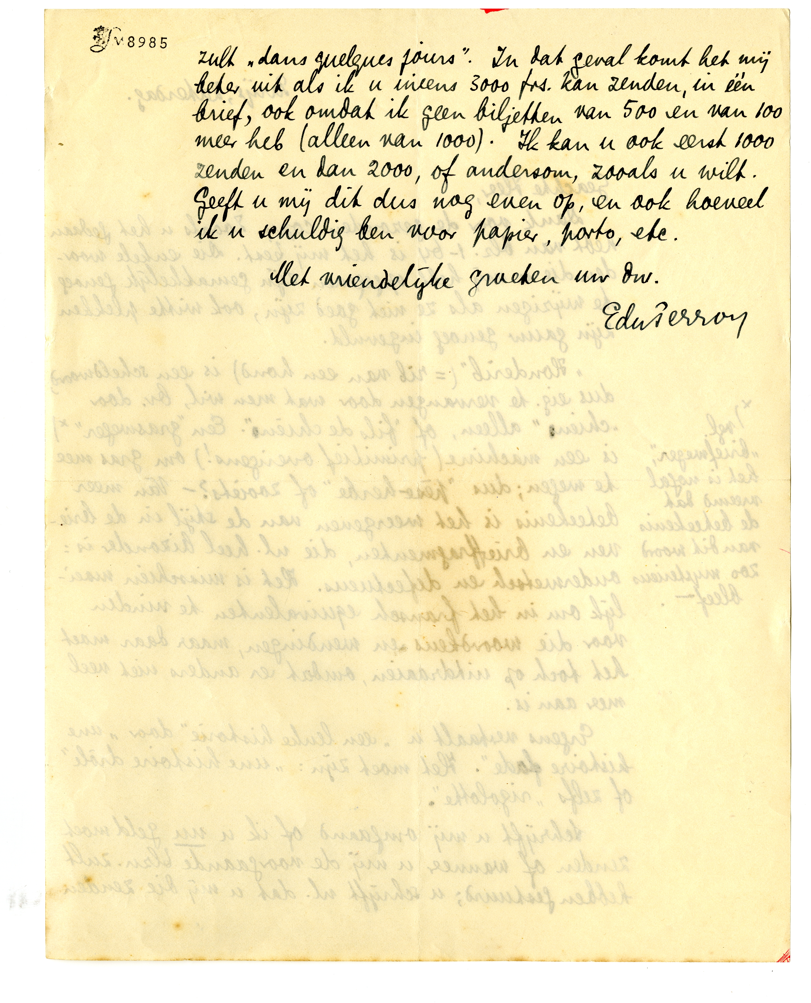Schrijft u mij omgaand of ik u nu geld moet zenden of wanneer u mij de voorgaande blzn. zult hebben gestuurd; u schrijft nl. dat u mij die zenden zult ‘dans quelques jours’. In dat geval komt het mij beter uit als ik u ineens 3000 frs. kan zenden, in één brief, ook omdat ik geen biljetten van 500 en van 100 meer heb (alleen van 1000). Ik kan u ook eerst 1000 zenden en dan 2000, of andersom, zooals u wilt. Geeft u mij dit dus nog even op, en ook hoeveel ik u schuldig ben voor papier, porto, etc.