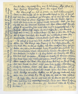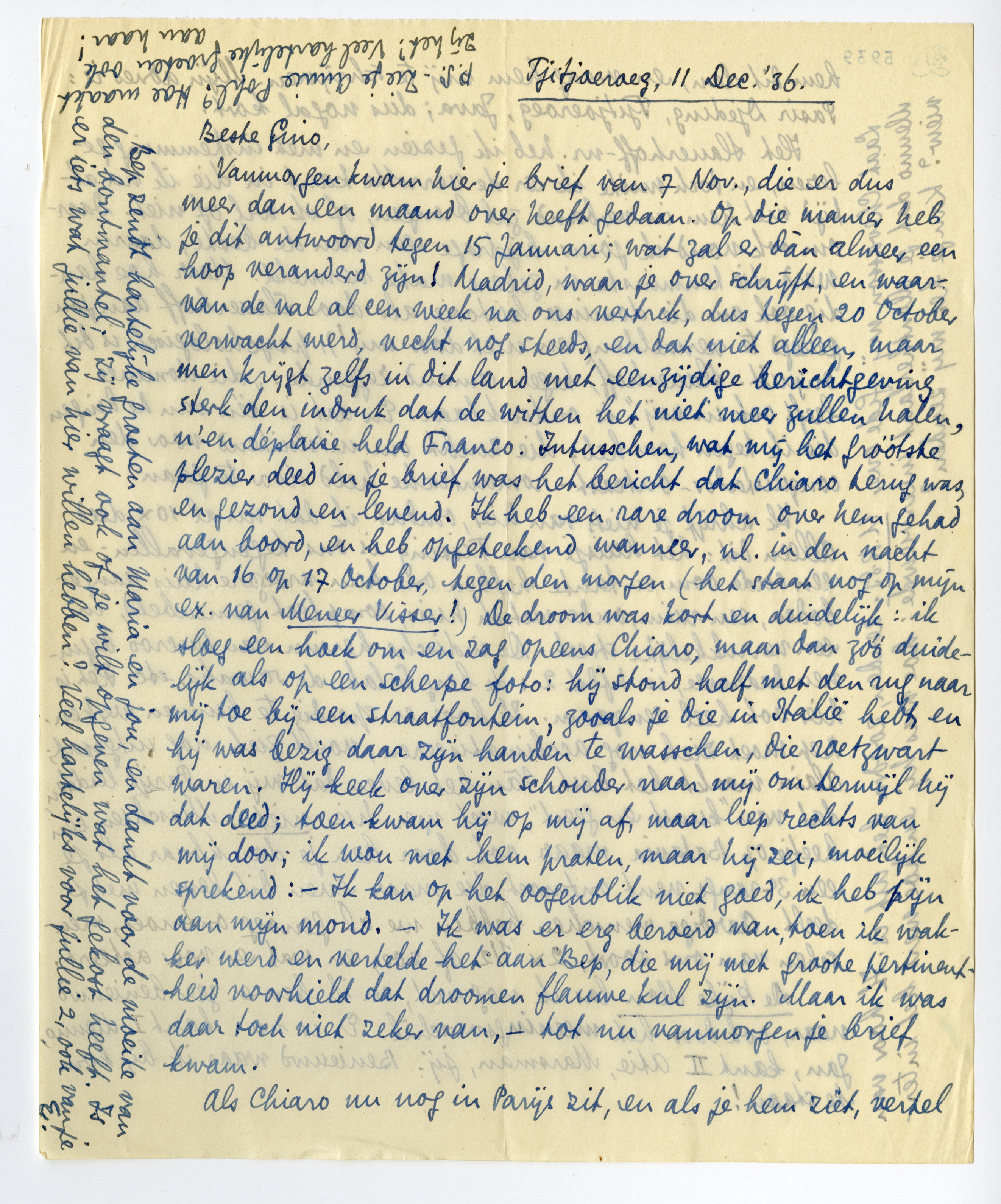 Vanmorgen kwam hier je brief van 7 Nov., die er dus meer dan een maand over heeft gedaan. Op die manier heb je dit antwoord tegen 15 Januari; wat zal er dàn alweer een hoop veranderd zijn! Madrid, waar je over schrijft, en waarvan de val al een week na ons vertrek, dus tegen 20 October verwacht werd, vecht nog steeds, en dat niet alleen, maar men krijgt zelfs in dit land met eenzijdige berichtgeving sterk den indruk dat de witten het niet meer zullen halen, n'en déplaise held Franco.7616 Intusschen, wat mij het gróótste plezier deed in je brief was het bericht dat Chiaro7617 terug was, en gezond en levend. Ik heb een rare droom over hem gehad aan boord, en heb opgeteekend wanneer, nl. in den nacht van 16 op 17 October, tegen den morgen (het staat nog op mijn ex. van Meneer Visser!). De droom was kort en duidelijk: ik sloeg een hoek om en zag opeens Chiaro, maar dan zóó duidelijk als op een scherpe foto: hij stond half met den rug naar mij toe bij een straatfontein, zooals je die in Italië hebt, en hij was bezig daar zijn handen te wasschen, die roetzwart waren. Hij keek over zijn schouder naar mij om terwijl hij dat deed; toen kwam hij op mij af, maar liep rechts van mij door; ik wou met hem praten, maar hij zei, moeilijk sprekend: - Ik kan op het oogenblik niet goed, ik heb pijn aan mijn mond. - Ik was er erg beroerd van, toen ik wakker werd en vertelde het aan Bep, die mij met groote pertinentheid voorhield dat droomen flauwe kul zijn. Maar ik was daar toch niet zeker van, - tot nu vanmorgen je brief kwam.
