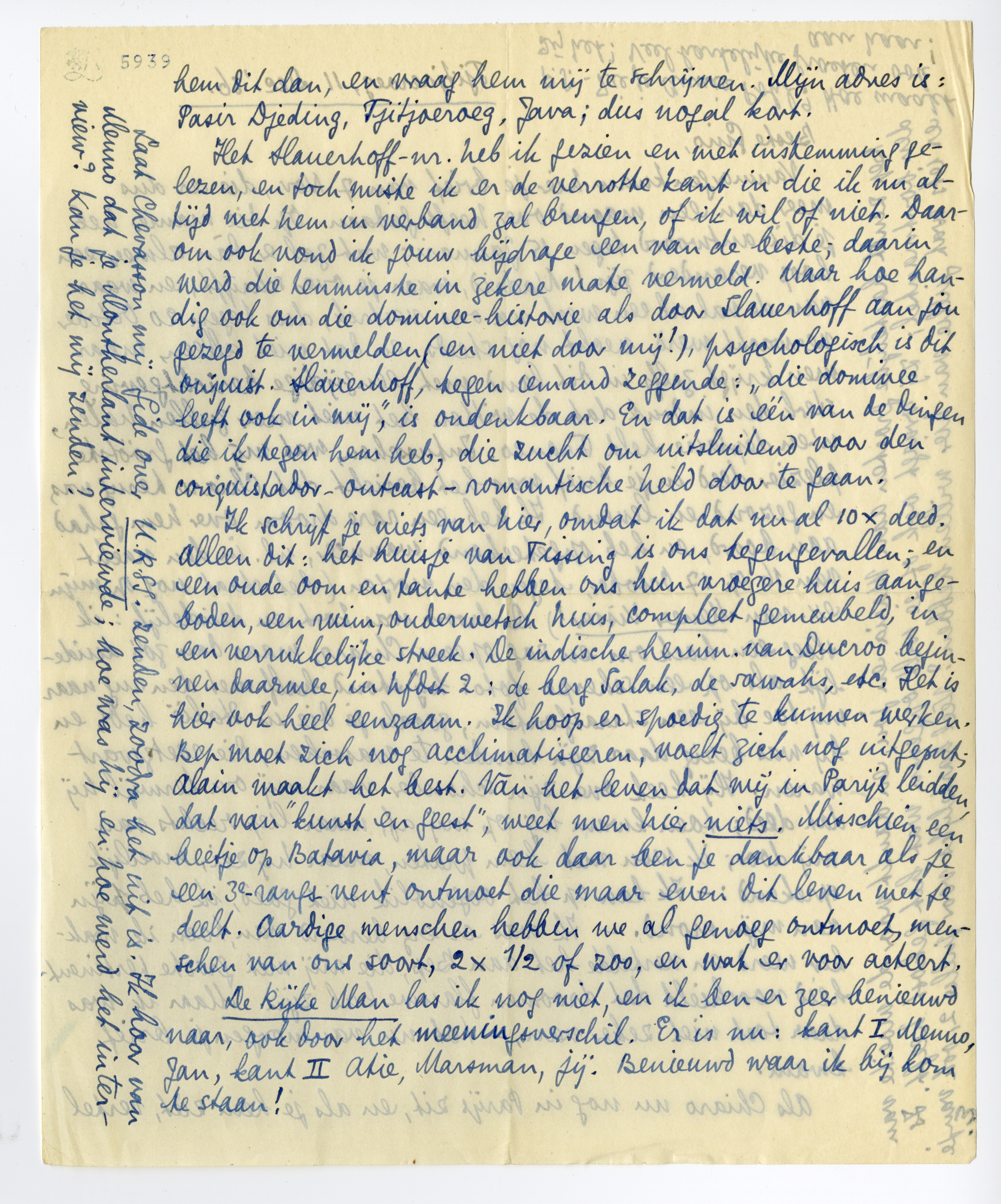 Ik schrijf je niets van hier, omdat ik dat nu al 10 ½ deed. Alleen dit: het huisje van Tissing is ons tegengevallen; en een oude oom en tante hebben ons hun vroegere huis aangeboden, een ruim, ouderwetsch huis, compleet gemeubeld, in een verrukkelijke streek. De indische herinn. van Ducroo beginnen daarmee, in hfdst 2: de berg Salak, de sawahs, etc. Het is hier ook heel eenzaam. Ik hoop er spoedig te kunnen werken. Bep moet zich nog acclimatiseeren, voelt zich nog uitgeput; Alain maakt het best. Van het leven dat wij in Parijs leidden, dat van ‘kunst en geest’, weet men hier niets. Misschien een beetje op Batavia, maar ook daar ben je dankbaar als je een 3e-rangs-vent ontmoet die maar even dit leven met je deelt. Aardige menschen hebben we al genoeg ontmoet, menschen van ons soort, 2 × ½ of zoo, en wat er voor acteert.