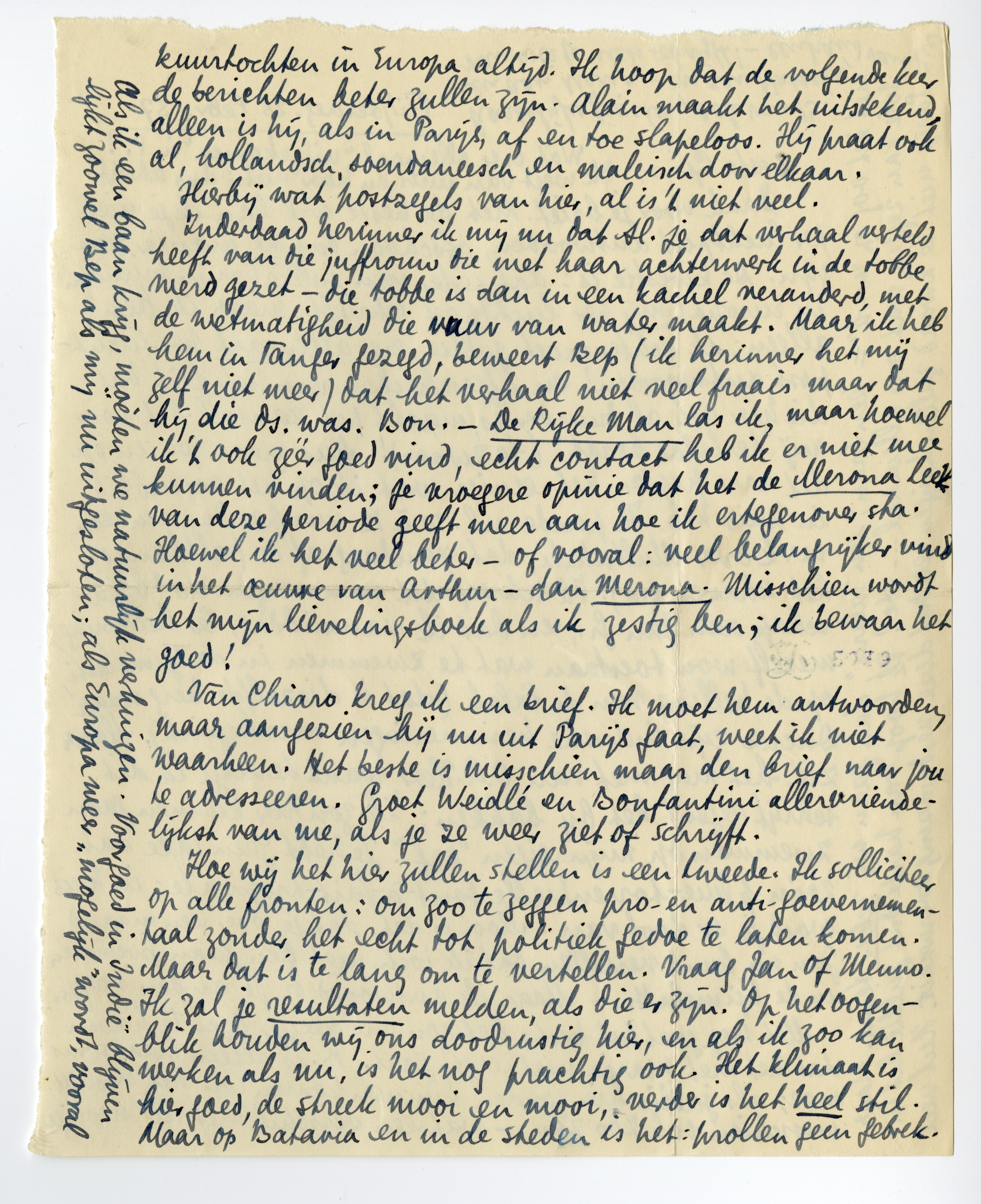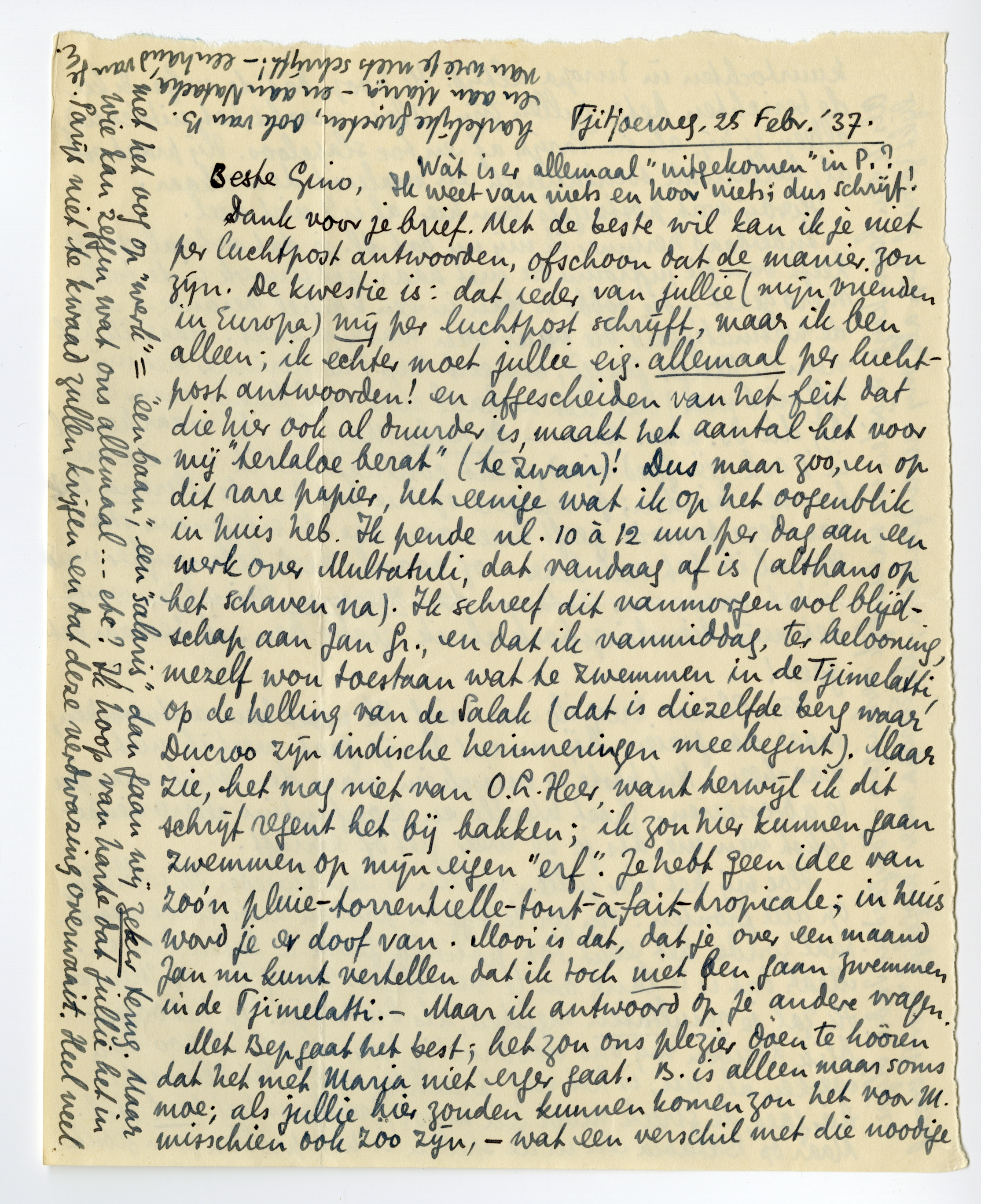Dank voor je brief. Met de beste wil kan ik je niet per luchtpost antwoorden, ofschoon dat de manier zou zijn. De kwestie is: dat ieder van jullie (mijn vrienden in Europa) mij per luchtpost schrijft, maar ik ben alleen; ik echter moet jullie eig. allemaal per luchtpost antwoorden! en afgescheiden van het feit dat die hier ook al duurder is, maakt het aantal het voor mij ‘terlaloe berat’ (te zwaar)! Dus maar zoo, en op dit rare papier, het eenige wat ik op het oogenblik in huis heb. Ik pende nl. 10 à 12 uur per dag aan een werk over Multatuli, dat vandaag af is (althans op het schaven na). Ik schreef7628 dit vanmorgen vol blijdschap aan Jan Gr., en dat ik vanmiddag, ter belooning, mezelf wou toestaan wat te zwemmen in de Tjimelatti, op de helling van de Salak (dat is diezelfde berg waar Ducroo zijn indische herinneringen mee begint).7629 Maar zie, het mag niet van O.L. Heer, want terwijl ik dit schrijf regent het bij bakken; ik zou hier kunnen gaan zwemmen op mijn eigen ‘erf’. Je hebt geen idee van zoo'n pluie-torrentielle-tout-à-fait-tropicale; in huis word je er doof van. Mooi is dat, dat je over een maand Jan nu kunt vertellen dat ik toch niet ben gaan zwemmen in de Tjimelatti. - Maar ik antwoord op je andere vragen.