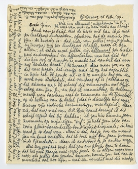 Hoe wij het hier zullen stellen is een tweede. Ik solliciteer op alle fronten: om zoo te zeggen pro- en anti-goevernementaal zonder het echt tot politiek gedoe te laten komen. Maar dat is te lang om te vertellen. Vraag Jan of Menno. Ik zal je resultaten melden, als die er zijn. Op het oogenblik houden wij ons doodrustig hier, en als ik zoo kan werken als nu, is het nog prachtig ook. Het klimaat is hier goed, de streek mooi en mooi, verder is het heel stil. Maar op Batavia en in de steden is het: prollen geen gebrek. Als ik een baan krijg, moèten we natuurlijk verhuizen. Voorgoed in Indië blijven lijkt zoowel Bep als mij nu uitgesloten; als Europa weer ‘mogelijk’ wordt, vooral met het oog op ‘werk’ = ‘een baan’, een ‘salaris’, dan gaan wij zeker terug. Maar wie kan zeggen wat ons allemaal... etc? Ik hoop van harte dat jullie het in Parijs niet te kwaad zullen krijgen en dat deze verdwazing overwaait. Heel veel hartelijke groeten, ook van B. en aan Maria - en aan Natacha,7632 van wie je niets schrijft! - een hand van je