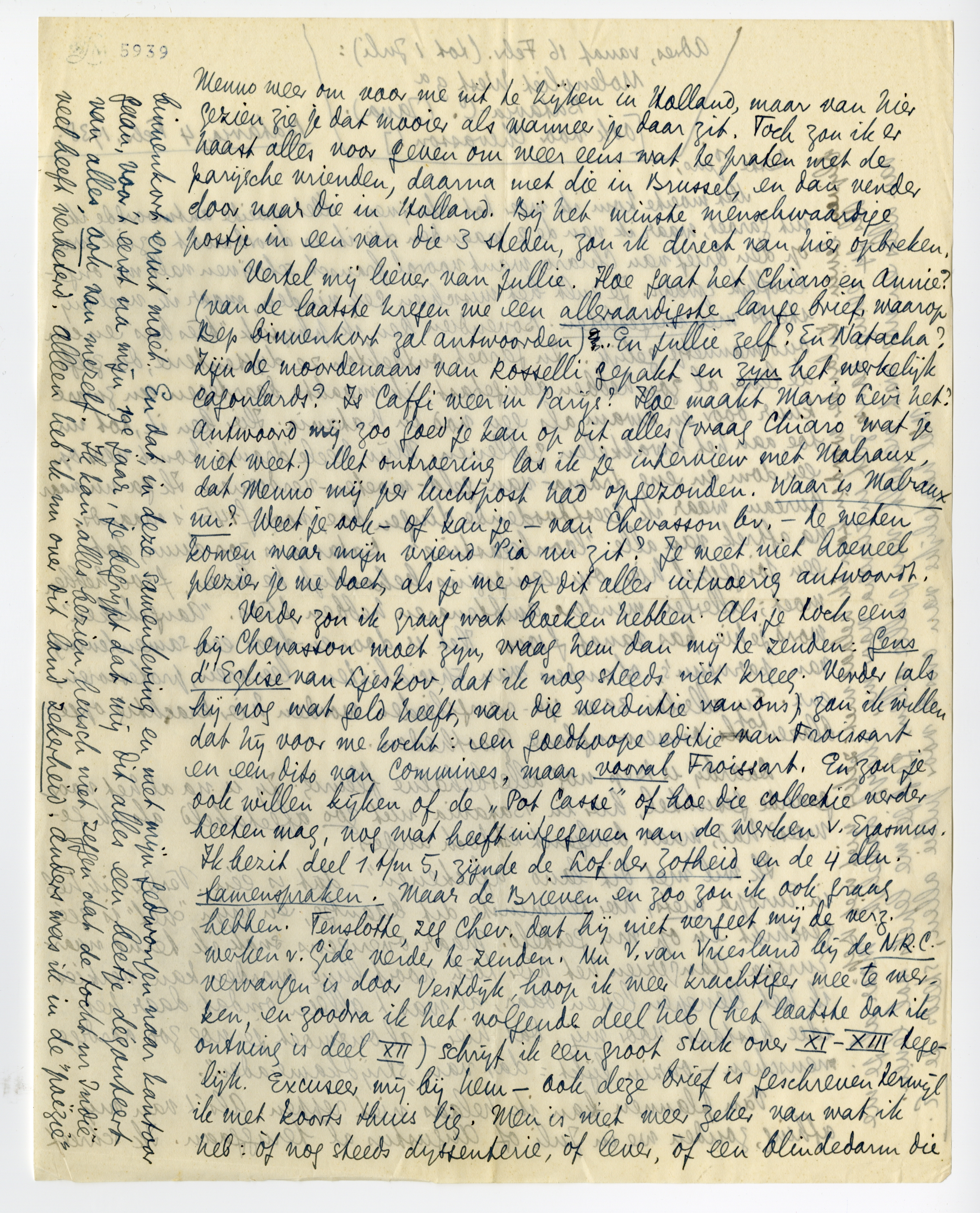 Vertel mij liever van jullie. Hoe gaat het Chiaro en Annie? (van de laatste kregen we een alleraardigste lange brief, waarop Bep binnenkort zal antwoorden). En jullie zelf? En Natacha? Zijn de moordenaars van Rosselli gepakt en zijn het werkelijk cagoulards?7666 Is Caffi7667 weer in Parijs? Hoe maakt Mario Levi7668 het? Antwoord mij zoo goedje kan op dit alles (vraag Chiaro wat je niet weet.) Met ontroering las ik je interview met Malraux,7669 dat Menno mij per luchtpost had opgezonden. Waar is Malraux nu? Weetje ook - of kan je - van Chevasson bv. - te weten komen waar mijn vriend Pia7670 nu zit? Je weet niet hoeveel plezier je me doet, als je me op dit alles uitvoerig antwoordt.