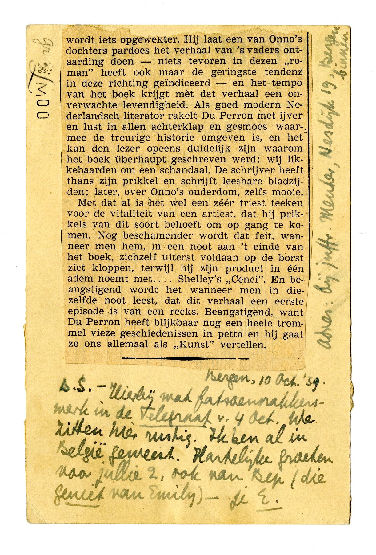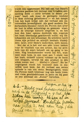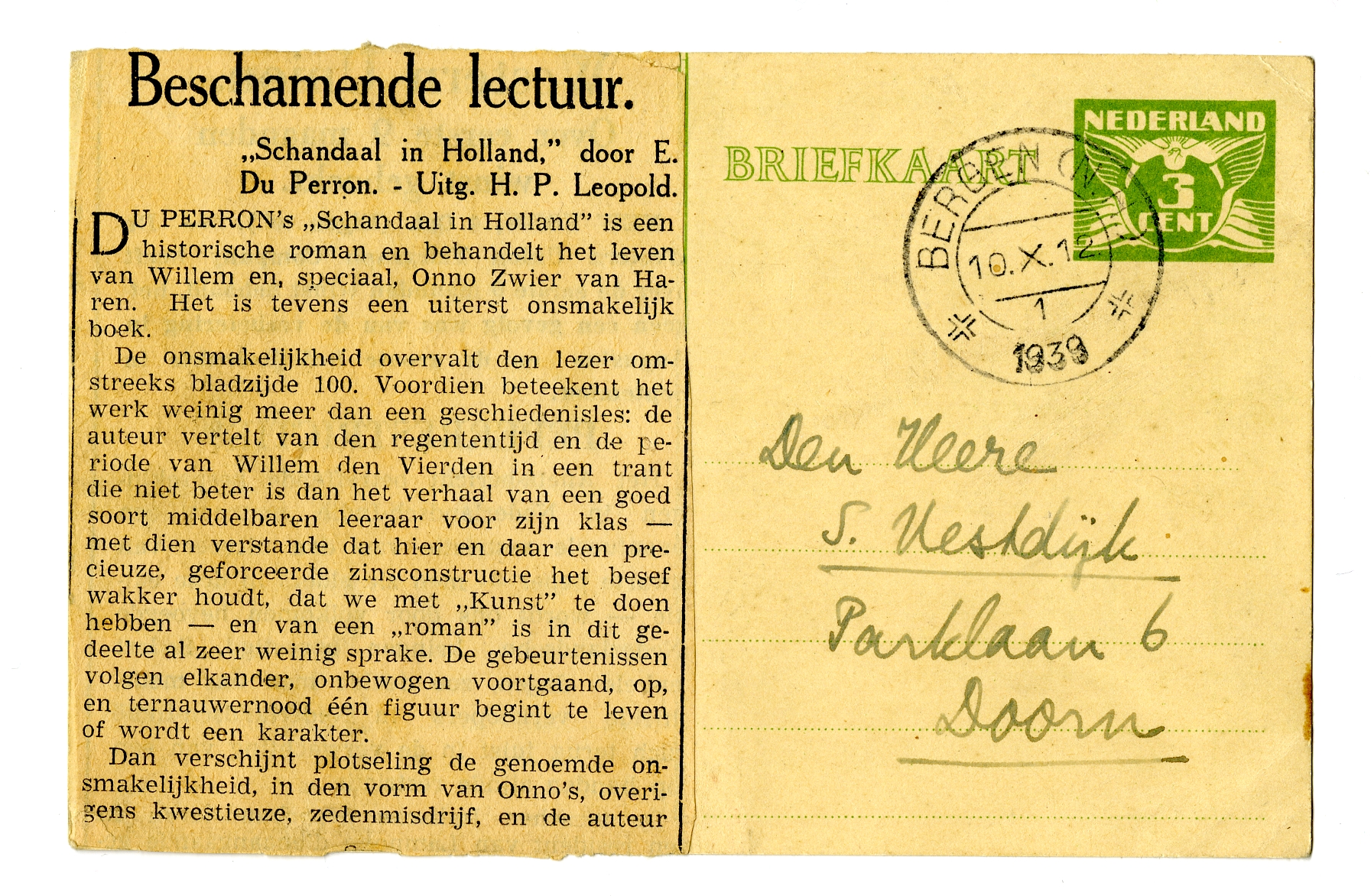 7718Op de voor- en achterkant van deze briefkaart was het artikeltje ‘Beschamende lectuur’ geplakt, een niet-ondertekende recensie van Schandaal in Holland uit De telegraafvan 4 oktober 1939 (av.).