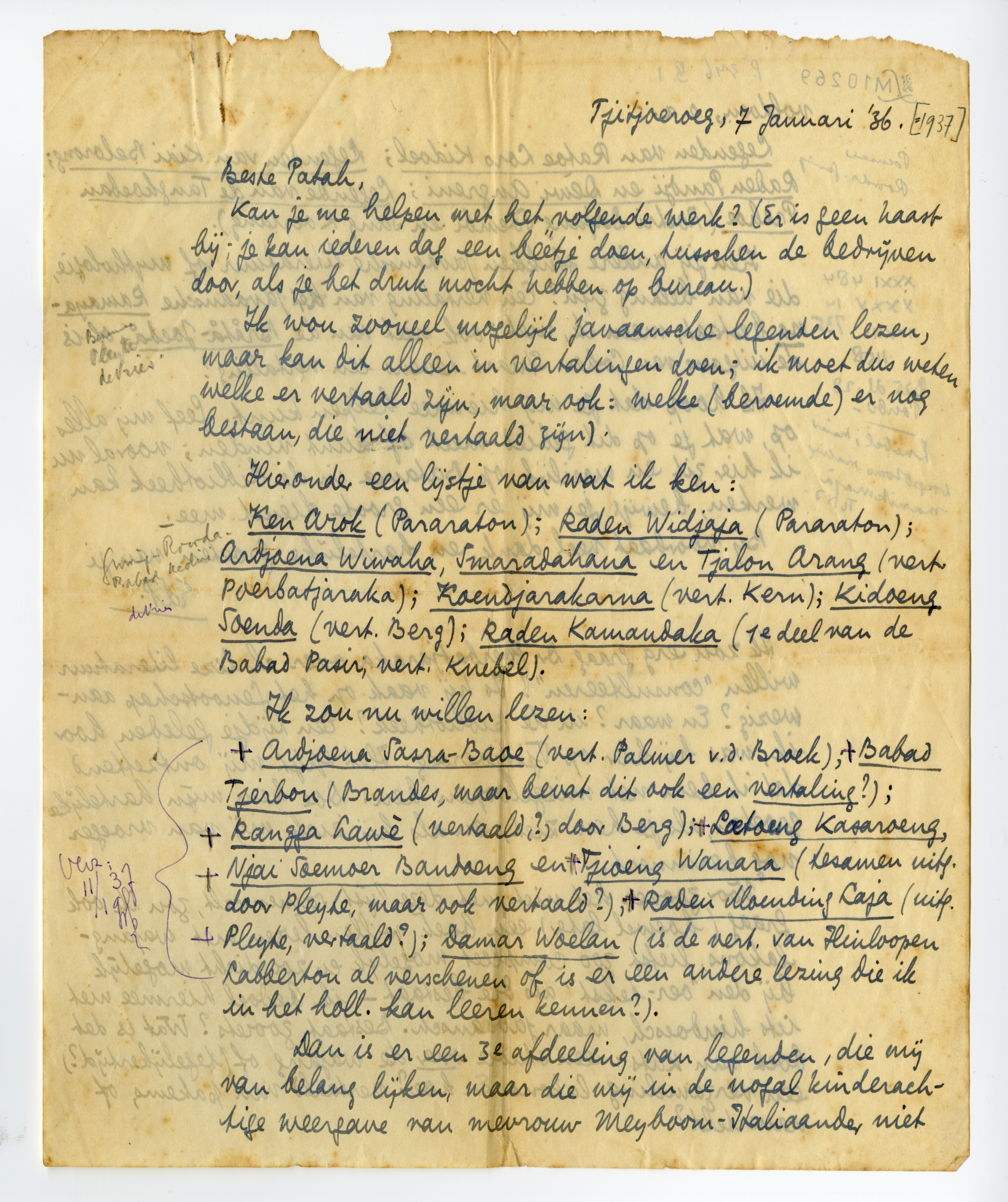 7825Patah noteerde hier in de marge: ‘XXXI 484/ XXXV 14 /XXXIII 735/ 1158/B 25 dl. 28/ Poerbo-/Knebel, Maier/ Wongsotomo maling/ manikmaja/Ts NI’. Patah dacht mogelijk aan L. Th. Mayer, ‘Vier Javaansche legenden uit de residentie Madioen’ in Bijdragen tot de taal-, land- en volkenkunde 42 (1893), p. 41-70, of aan Mayers Een blik in het Javaansche volksleven, Leiden 1897, 2 din. Wongsotomo maling verwijst naar A. Jonkers, Wangsatama mamaling (Wongsotomo gaat uit stelen) en vijftien andere lakon's, Leiden 1934, een verzameling van zestien wajangverhalen met korte samenvatting in het Nederlands.