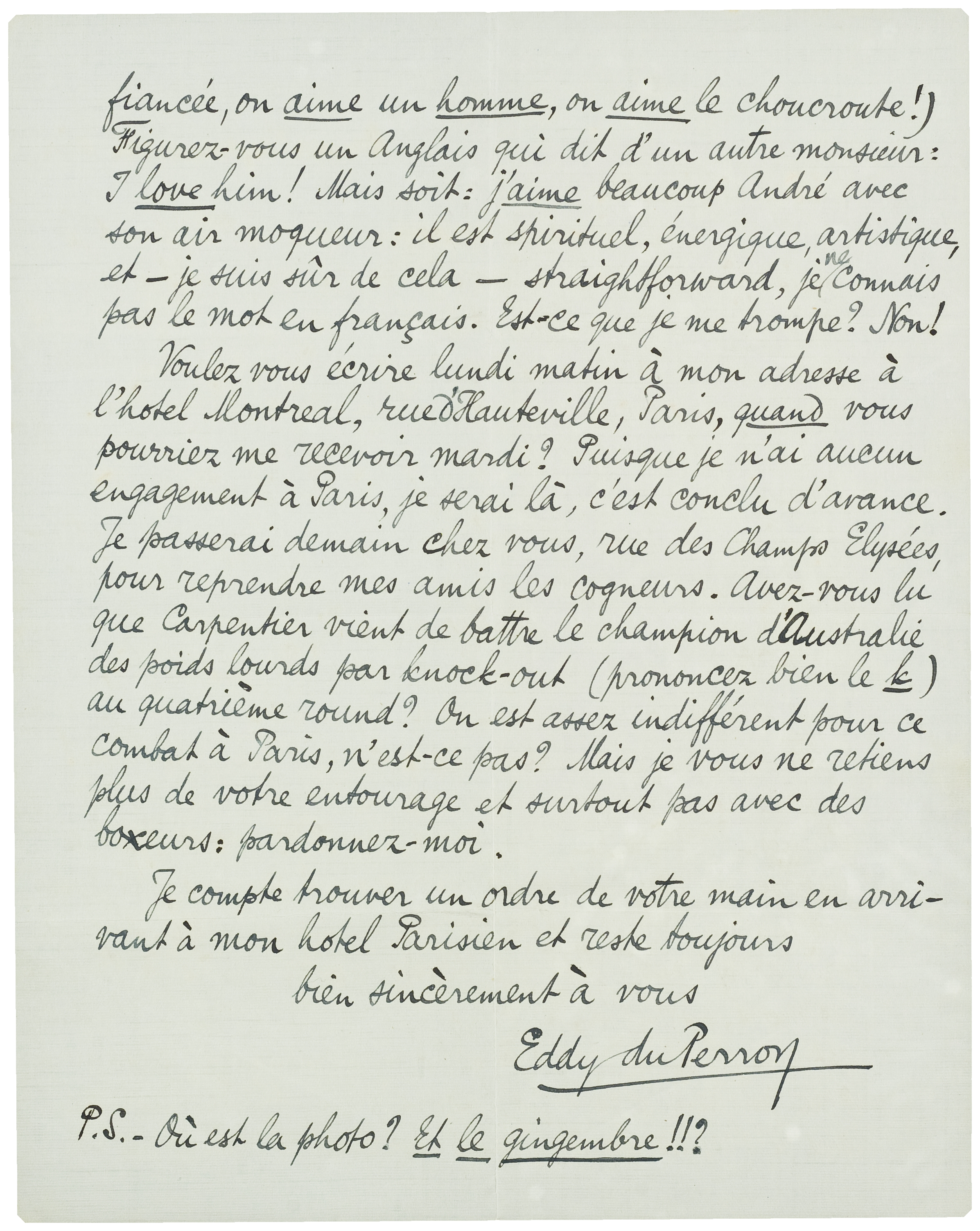 Voulez vous écrire lundi matin à mon adresse à l'hotel Montreal, rue d'Hauteville, Paris, quand vous pourriez me recevoir mardi? Puisque je n'ai aucun engagement à Paris, je serai là, c'est conclu d'avance. Je passerai demain chez vous, rue des Champs Elysées, pour reprendre mes amis les cogneurs. Avez-vous lu que Carpentier vient de battre le champion d'Australie des poids lourds par knock-out (prononcez bien le k) au quatrième round? On est assez indifférent pour ce combat à Paris, n'est-ce pas? Mais je vous ne retiens plus de votre entourage et surtout pas avec des boxeurs: pardonnez-moi.