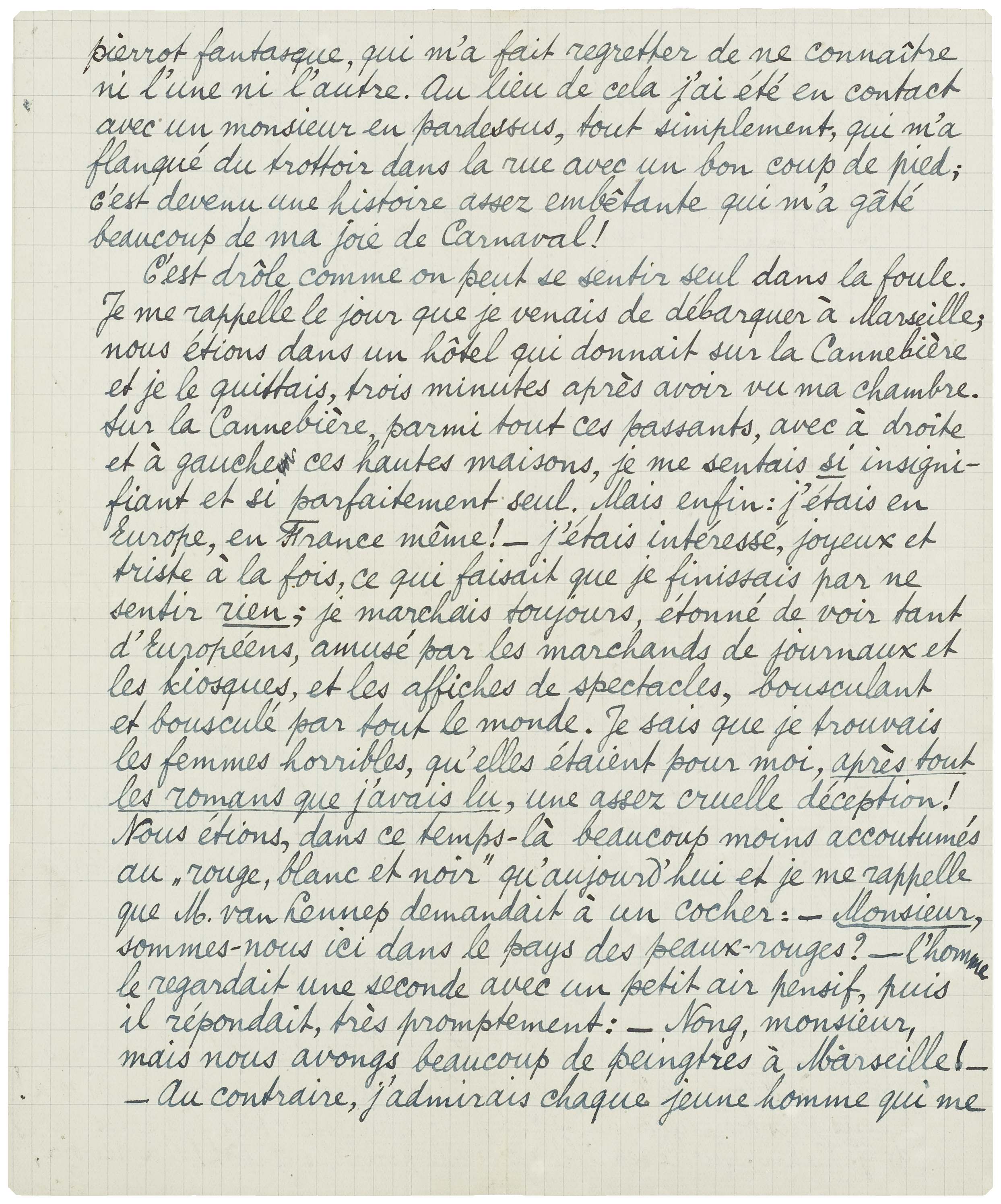 C'est drôle comme on peut se sentir seul dans la foule. Je me rappelle le jour que je venais de débarquer à Marseille; nous étions dans un hôtel qui donnait sur la Cannebière et je le quittais, trois minutes après avoir vu ma chambre. Sur la Cannebière, parmi tous ces passants, avec à droite et à gauche ces hautes maisons, je me sentais si insignifiant et si parfaitement seul. Mais enfin: j'étais en Europe, en France même! - j'étais intéressé, joyeux et triste à la fois, ce qui faisait que je finissais par ne sentir rien; je marchais toujours, étonné de voir tant d'Européens, amusé par les marchands de journaux et les kiosques, et les affiches de spectacles, bousculant et bousculé par tout le monde. Je sais que je trouvais les femmes horribles, qu'elles étaient pour moi, après tout les romans que j'avais lu, une assez cruelle déception! Nous étions, dans ce temps-là beaucoup moins accoutumés au ‘rouge, blanc et noir’ qu'aujourd'hui et je me rappelle que M. van Lennep demandait à un cocher: - Monsieur, sommes-nous ici dans le pays des peaux-rouges? - l'homme le regardait une seconde avec un petit air pensif, puis il répondait, très promptement: - Nong, monsieur, mais nous avongs beaucoup de peingtres à Marseille! - Au contraire, j'admirais chaque jeune homme qui me passait sur le boulevard; je lui enviais son aise, sa manière de marcher, de tenir la tête, ses regards insolents, et beaucoup d'autres ‘accomplishments’, - comme je fais encore aujourd'hui, de temps en temps. Le premier que je voyais avec un grand chapeau mou et un pardessus - c'était pourtant en été - me paraissait un héros de roman.