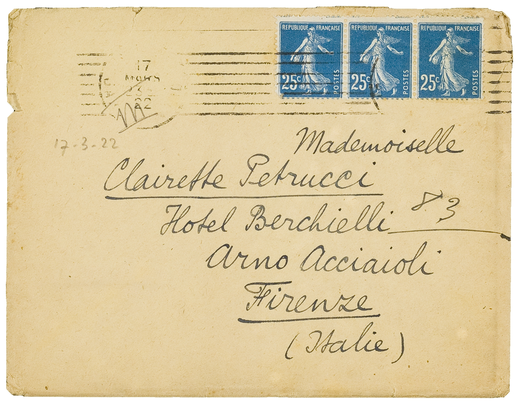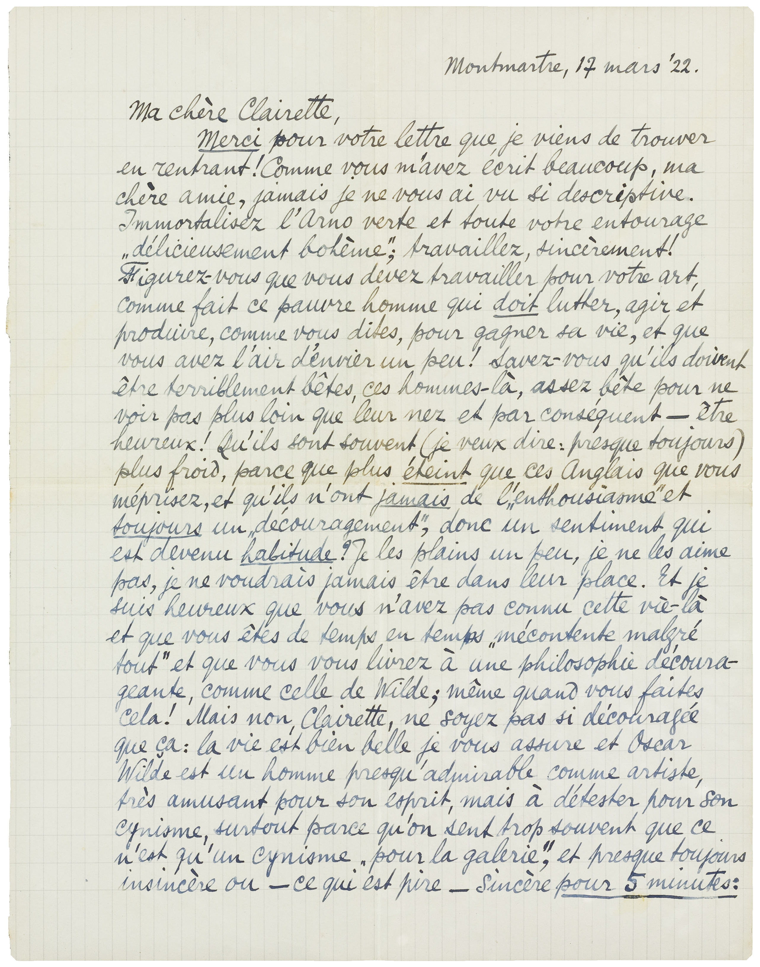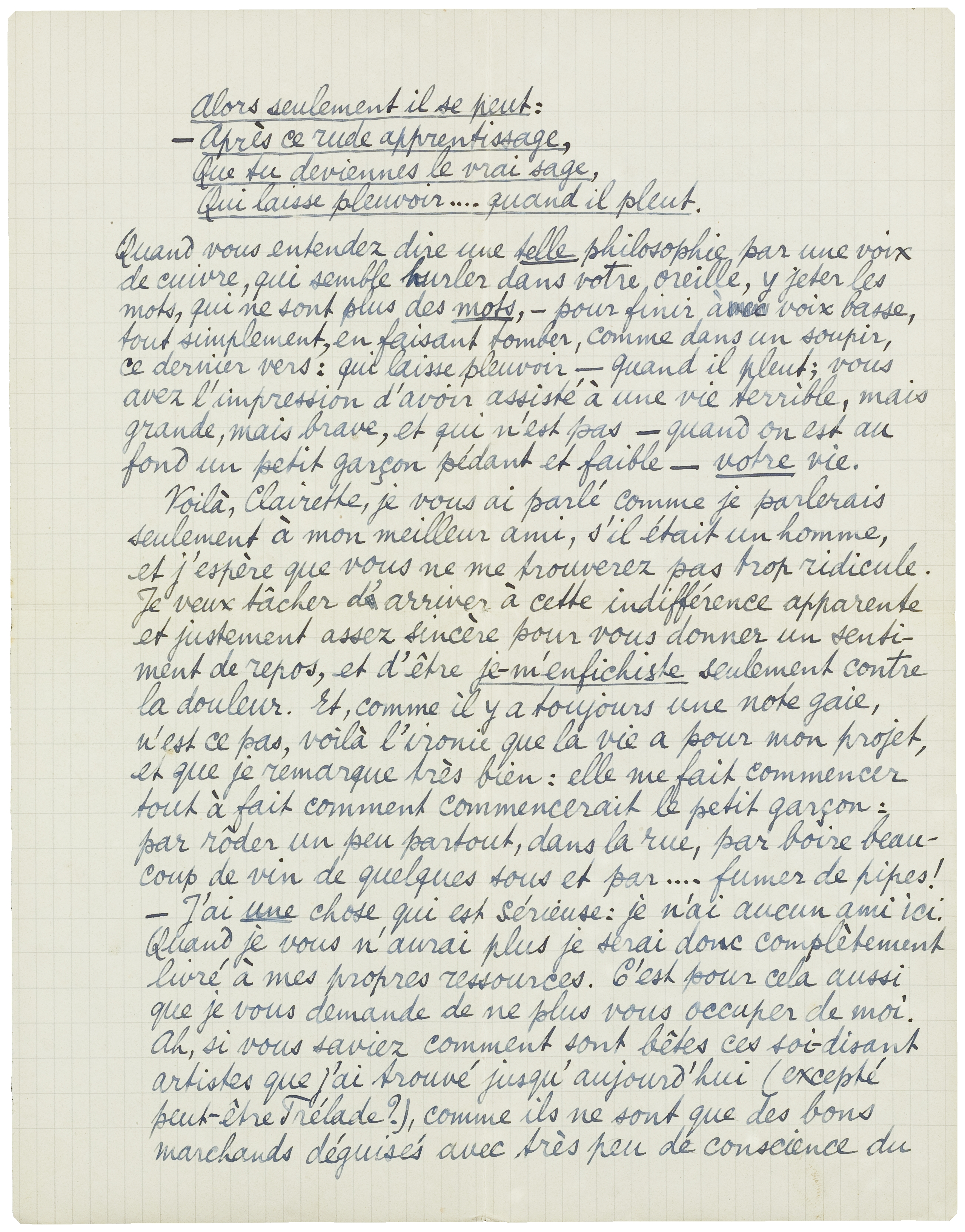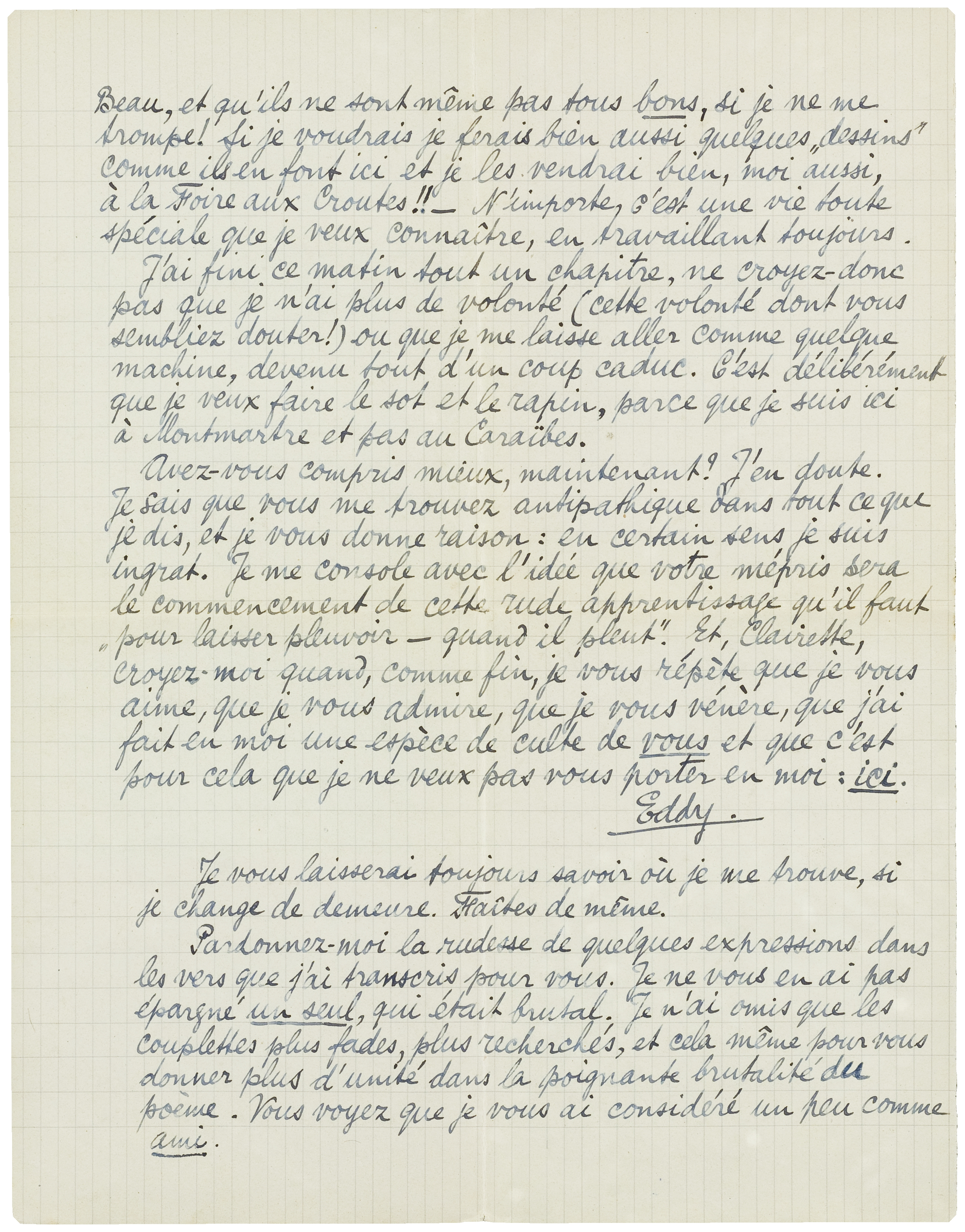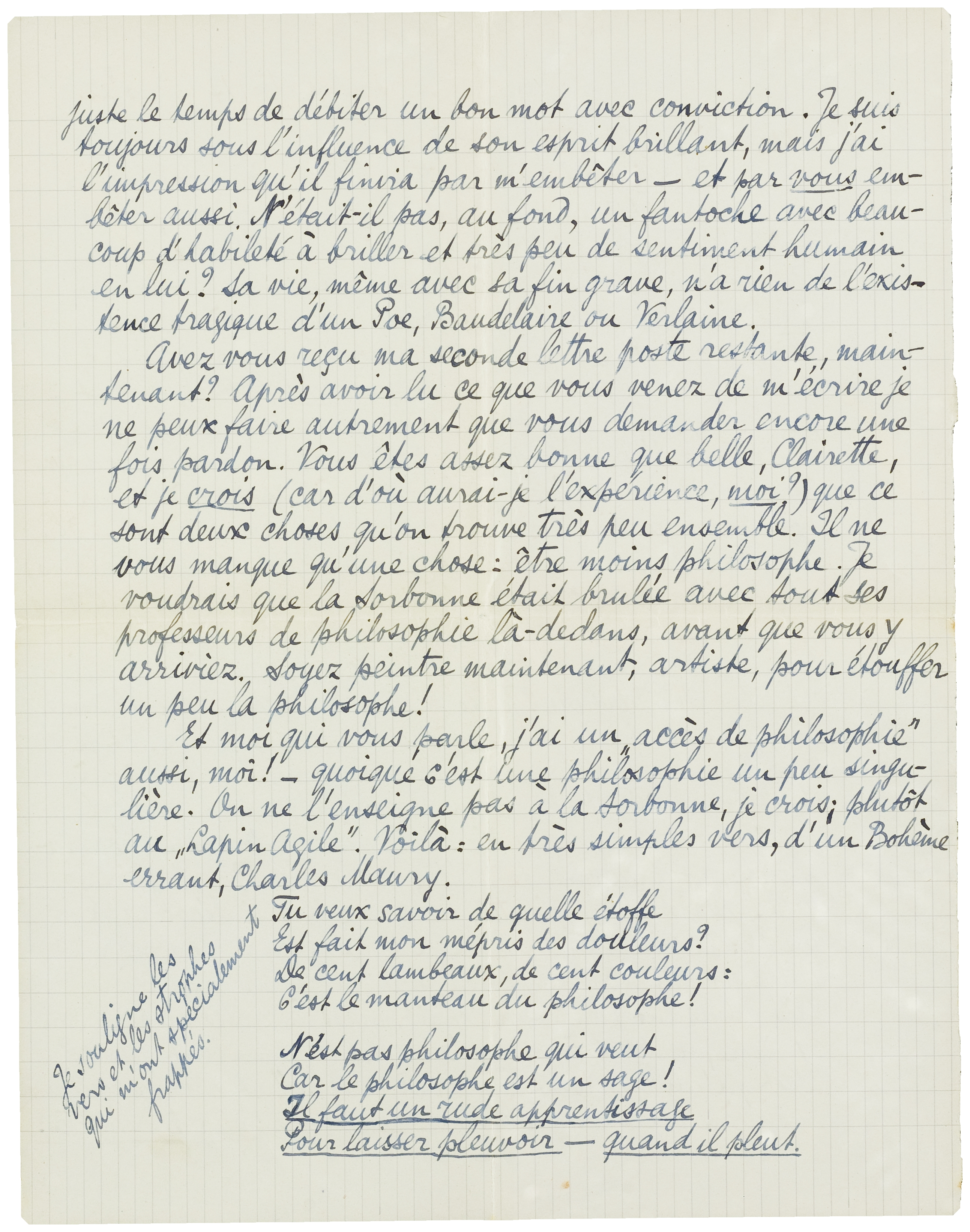 Avez-vous reçu ma seconde lettre poste restante, maintenant? Après avoir lu ce que vous venez de m'écrire je ne peux faire autrement que vous demander encore une fois pardon. Vous êtes assez bonne que belle, Clairette, et je crois (car d'où aurai-je l'expérience, moi?) que ce sont deux choses qu'on trouve très peu ensemble. Il ne vous manque qu'une chose: être moins philosophe. Je voudrais que la Sorbonne était brulée avec tout ses professeurs de philosophie là-dedans, avant que vous y arriviez. Soyez peintre maintenant, artiste, pour étouffer un peu la philosophe!