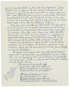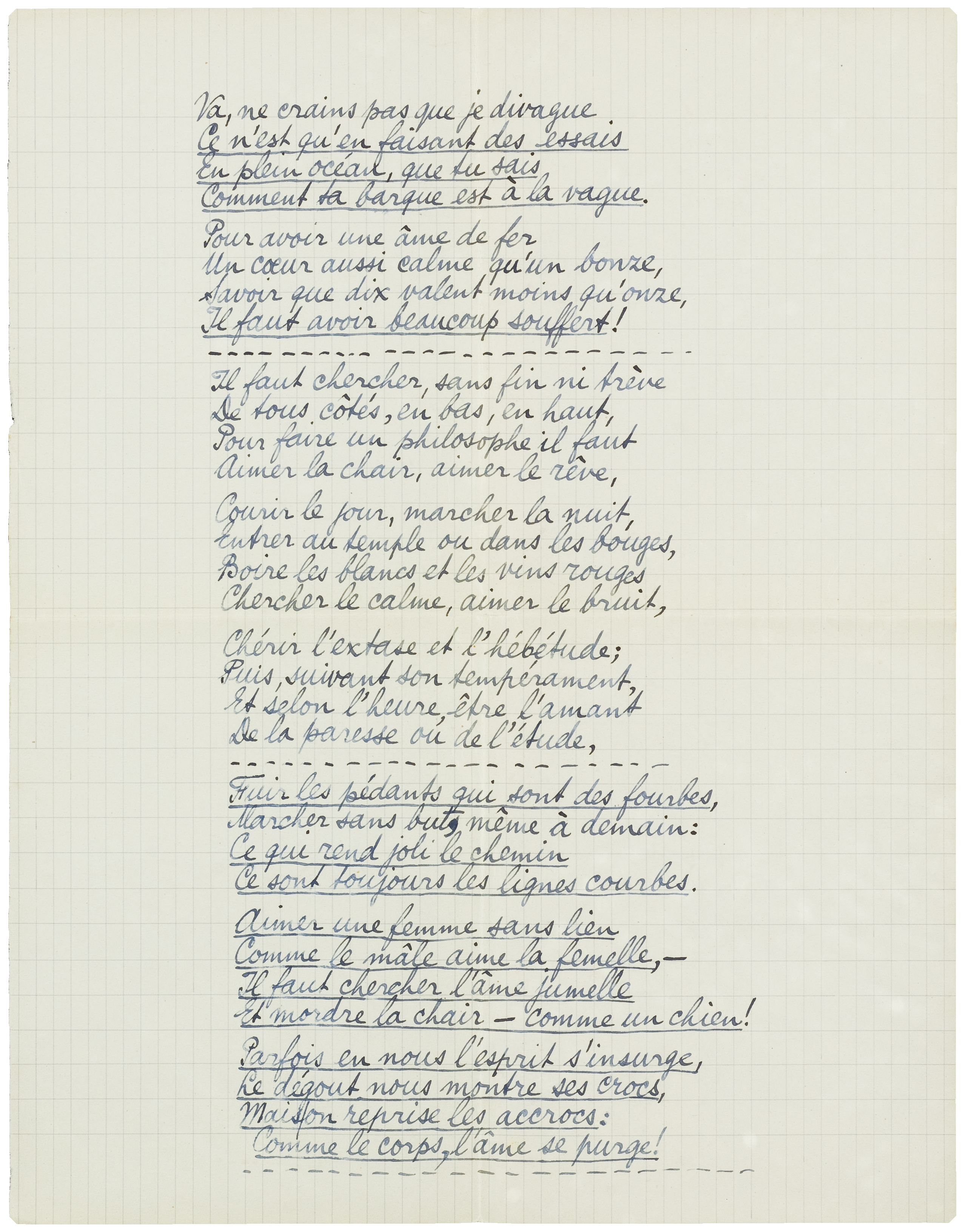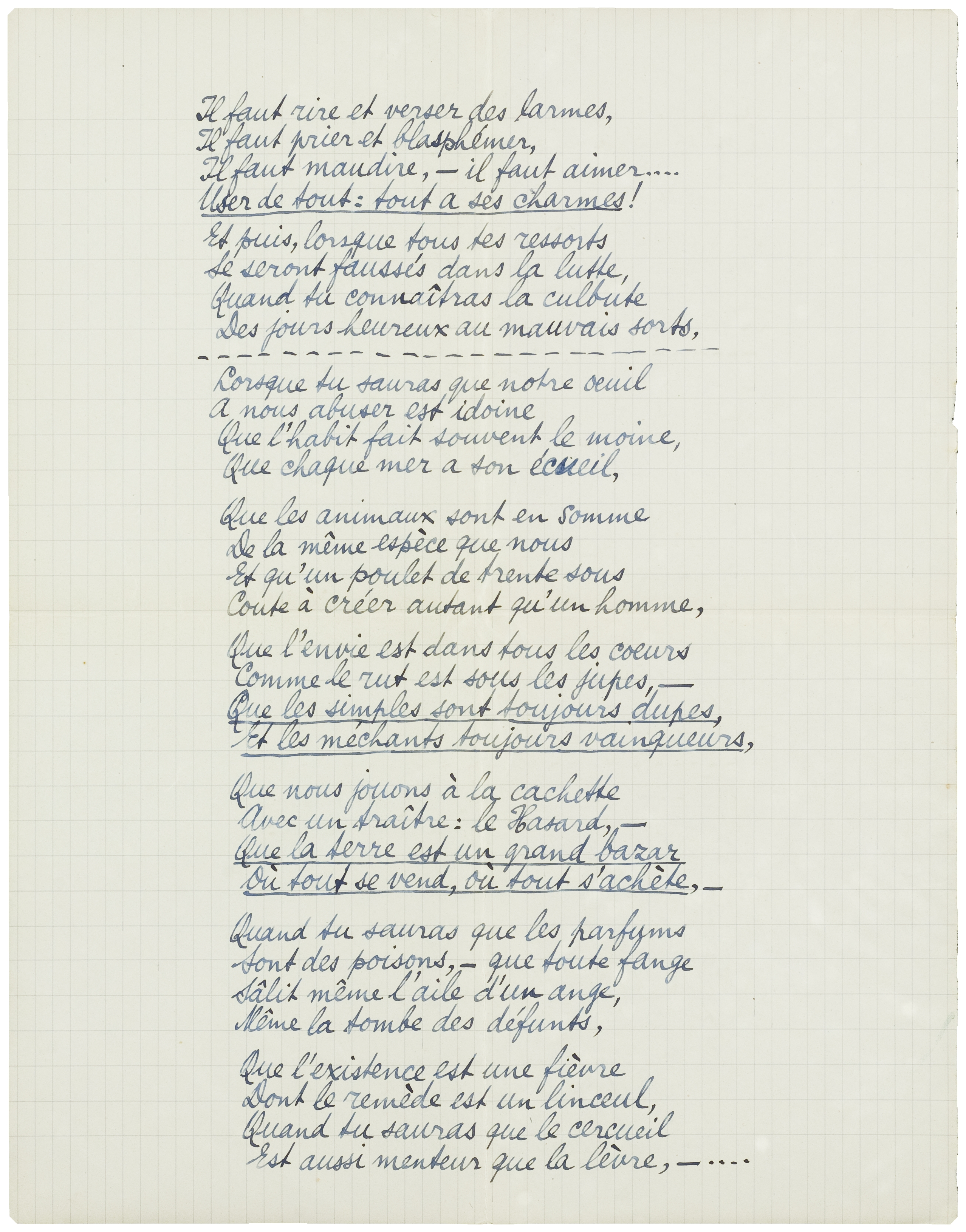 Et moi qui vous parle, j'ai un ‘accès de philosophie’ aussi, moi! - quoique c'est une philosophie un peu singulière. On ne l'enseigne pas à la Sorbonne, je crois; plutôt au Lapin Agile. Voilà: en très simples vers, d'un Bohème errant, Charles Maury.*