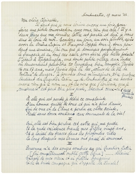Aussi je vous envoie une chanson, faute de dédicace de l'auteur (que je ne connais pas encore mais que je connaîtrai peut-etre dans 8 jours) dédié à vous par moi. C'est une chansonnette, pas trop mal rimée, comme vous verrez, qui veut prouver que ‘la bohème n'est pas morte’, et d'après ce que j'ai vu, dans les quelques jours déjà que je suis ici, je la crois. Seulement, il me faut quitter ce quartier ‘Burq’, trop bourgeois, et demeurer en haut de la Butte. Ici on n'a que de boulangers.