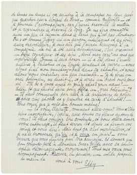 - Et vous, Clairette, comment allez-vous? Vous n'êtes plus insatisfaite, j'espère, avec toutes ces fleurs autour de vous? Il faut vouloir être contente, et vous allez aimer votre entourage, il faut serrer les dents et fermer vos poings et vous dire: Mais tout ça c'est merveilleux, et je ne le trouverai qu'ici et je veux en jouir! - vous verrez que vous finirez par être heureuse. Et donnez un bon coup-de-pied à Monsieur Oscar Wilde avec sa philosophie décourageante, croyez-moi! Tout mes voeux vous accompagnent. Recevez, en pensées, une solide poignée de main de