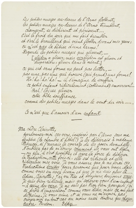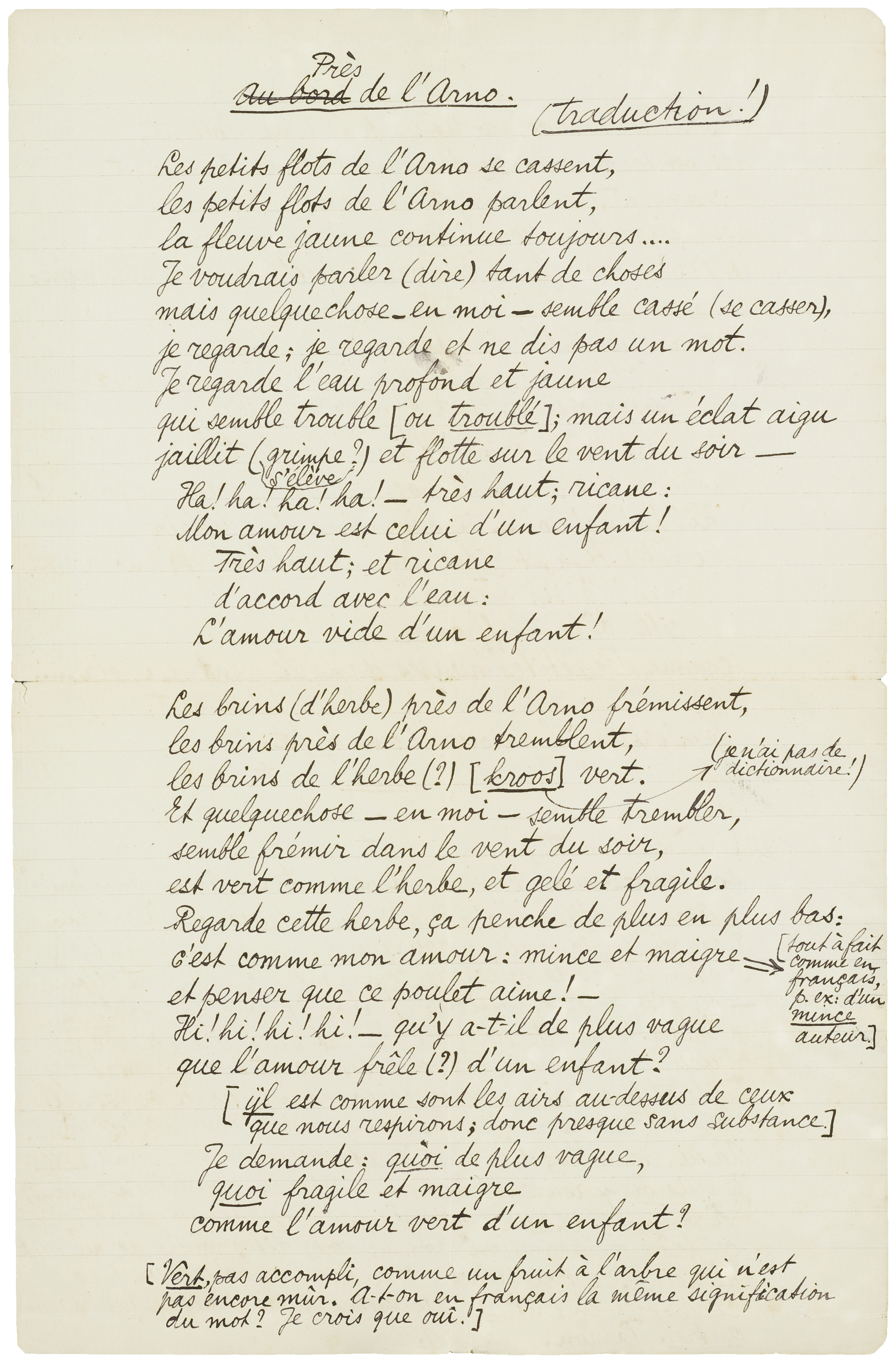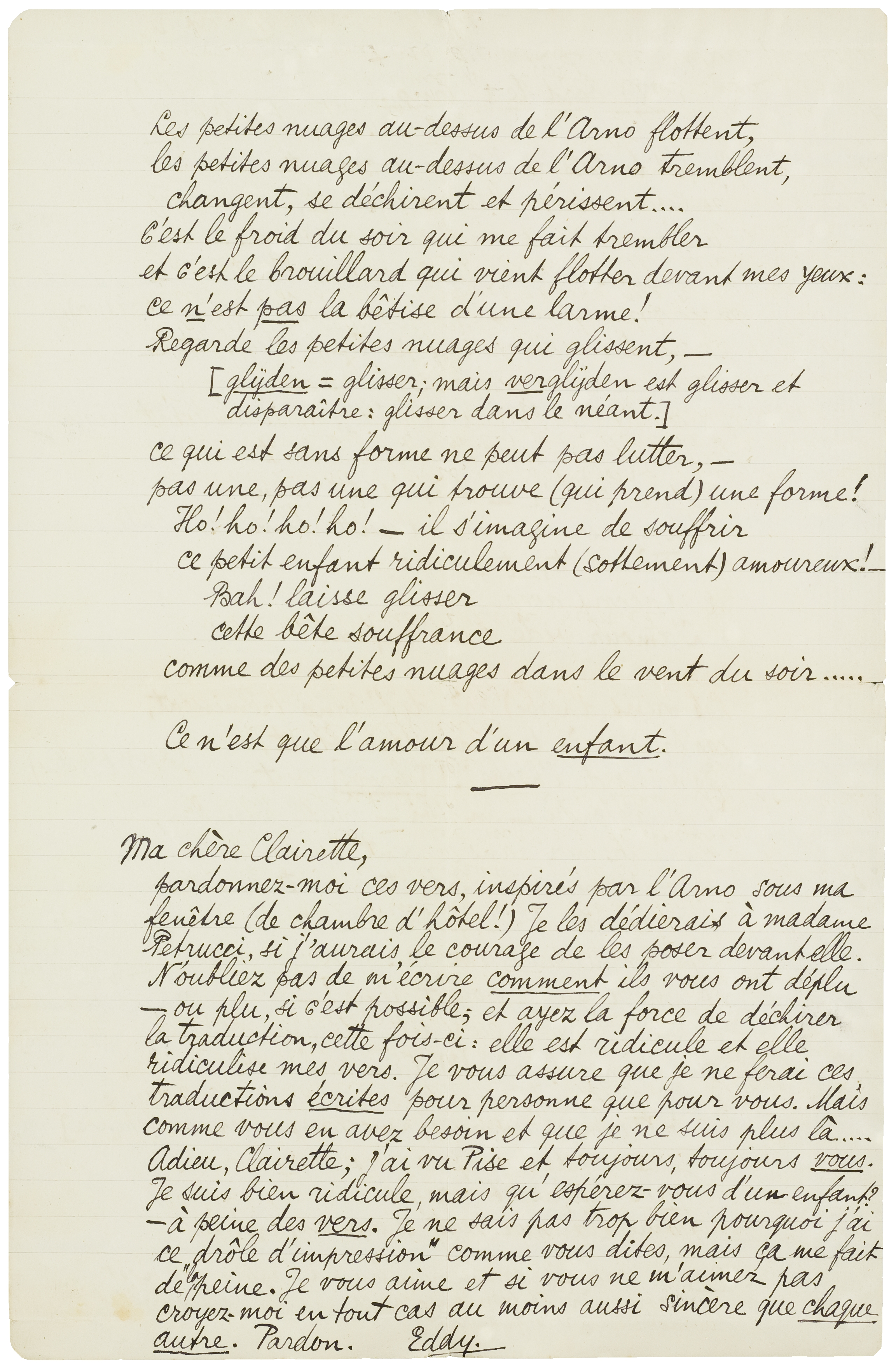 pardonnez-moi ces vers, inspirés par l'Arno sous ma fenêtre (de chambre d'hôtel!) Je les dédierais à madame Petrucci, si j'aurai le courage de les poser devant elle. N'oubliez pas de m'écrire comment ils vous ont déplu - ou plu, si c'est possible; et ayez la force de déchirer la traduction, cette fois-ci: elle est ridicule et ridiculise mes vers. Je vous assure que je ne ferai ces traductions écrites pour personne d'autre que pour vous. Mais comme vous en avez besoin et que je ne suis plus là..... Adieu, Clairette; j'ai vu Pise et toujours, toujours vous. Je suis bien ridicule, mais qu'espérez-vous d'un enfant? - à peine des vers. Je ne sais pas trop bien pourquoi j'ai ce ‘drôle d'impression’ comme vous dites, mais ça me fait de la peine. Je vous aime et si vous ne m'aimez pas croyez-moi en tout cas au moins aussi sincère que chaque autre. Pardon.