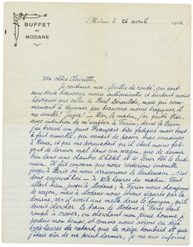Mais en même temps que vous avez compris que j'ai refusé avec beaucoup de dédain, et c'est cela la cause que je vous écris de nouveau ‘en route’, c.à.d. dans la salle du buffet de la gare où je suis immobilisé pour trois heures. Il fait un froid de loup, Modane est blanc et bleu de neige, et j'ai commandé du papier, de l'encre, etc. plus une bénédictine: pas parce que j'aime tant ce liqueur, mais parce que j'ai les mains gélés, et peut-être l'estomac!