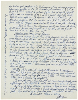 A 11h.35 part d'ici un affreux omnibus qui ne sera à Paris que demain vers 6 heures. Je crois que je le prendrai, car ‘j'en ai marre’. Espérons que ma prochaine lettre sera de Paris.
