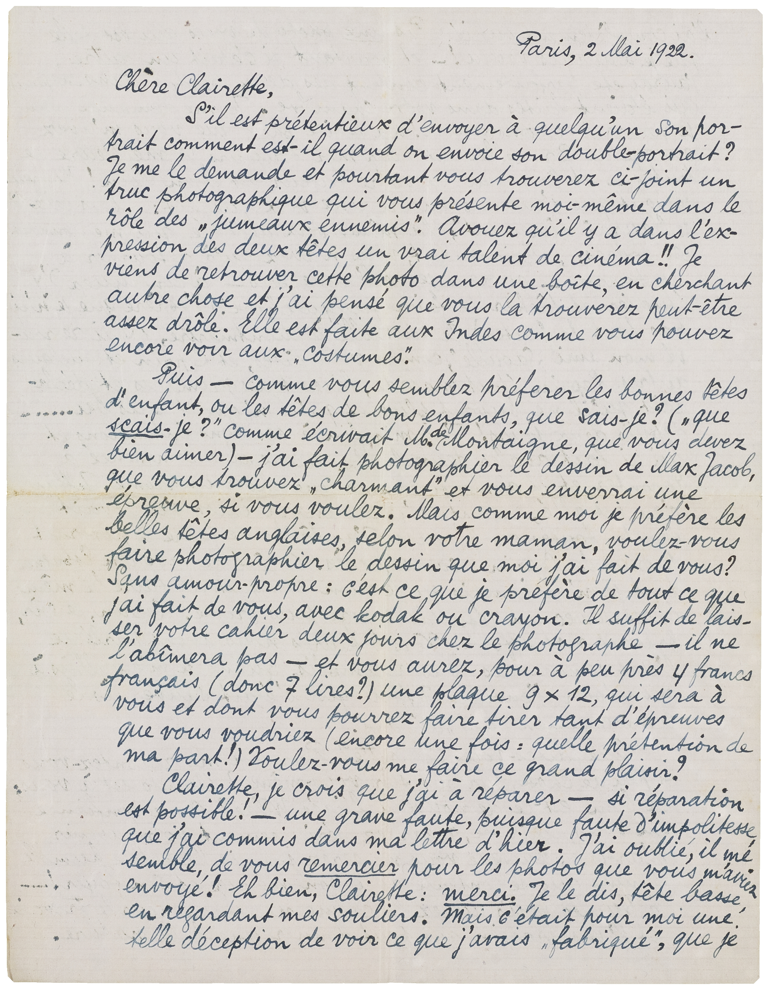 Puis - comme vous semblez préferer les bonnes têtes d'enfant, ou les têtes de bons enfants, que sais-je? (‘que scais-je?’ comme écrivait M. de Montaigne, que vous devez bien aimer) - j'ai fait photographier le dessin de Max Jacob, que vous trouvez ‘charmant’ et vous enverrai une épreuve, si vous voulez. Mais comme moi je préfère les belles têtes anglaises, selon votre maman, voulez-vous faire photographier le dessin que moi j'ai fait de vous? Sans amour-propre: c'est ce que je préfère de tout ce que j'ai fait de vous, avec kodak ou crayon. Il suffit de laisser votre cahier deux jours chez le photographe - il ne l'abîmera pas - et vous aurez, pour à peu près 4 francs français (donc 7 lires?) une plaque 9 × 12, qui sera à vous et dont vous pourrez faire tirer tant d'épreves que vous voudriez (encore une fois: quelle prétention de ma part!) Voulez-vous me faire ce grand plaisir?