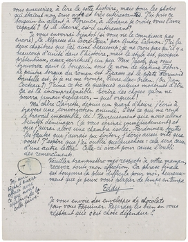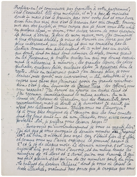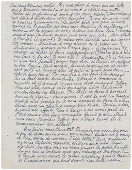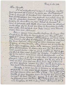 Ma chère Clairette, depuis un quart d'heure j'écris à travers une conversation animée. C'est ce qui me rend le travail impossible, ici! Heureusement que nous allons bientôt déménager (je vous écrirai immédiatement) et que j'aurai alors une chambre isolée. Pardonnez toutes ces fautes que j'aurais pu éviter; j'écris aussi vite que vous! J'espère que j'ai oublié quelquechose: cela sera cause d'une autre lettre. Celle-ci avait pour cause l'oubli des remerçiments.