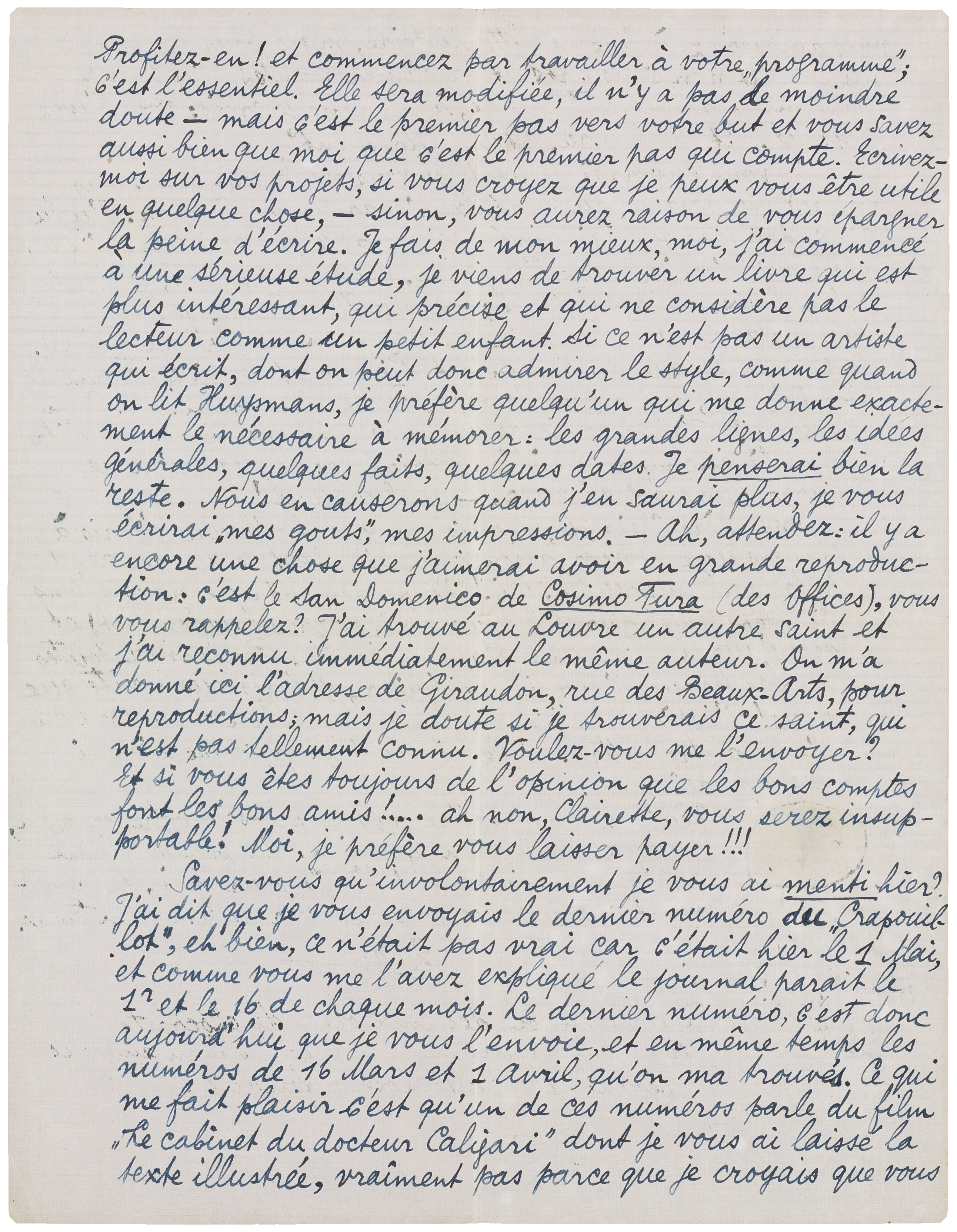 Savez-vous qu'involontairement je vous ai menti hier? J'ai dit que je vous envoyais le dernier numéro du Crapouillot, et bien, ce n'était pas vrai car c'était hier le 1 Mai, et comme vous me l'avez expliqué le journal paraît le 1r et le 16 de chaque mois. Le dernier numéro, c'est donc aujourd'hui que je vous l'envoie, et en même temps les numéros de 16 Mars et 1 Avril, qu'on ma trouvés. Ce qui me fait plaisir c'est qu'un de ces numéros parle du film Le cabinet du docteur Caligari dont je vous ai laissé la texte illustrée, vraîment pas parce que je croyais que vous vous amuseriez à lire la sotte histoire, mais pour les photos qui étaient non sans art et très intéressantes. J'ai pris ce bouquin en allant à Florence, à Modane je crois; vous l'avez regardé? Et M. Maurel, est-il intéressant?