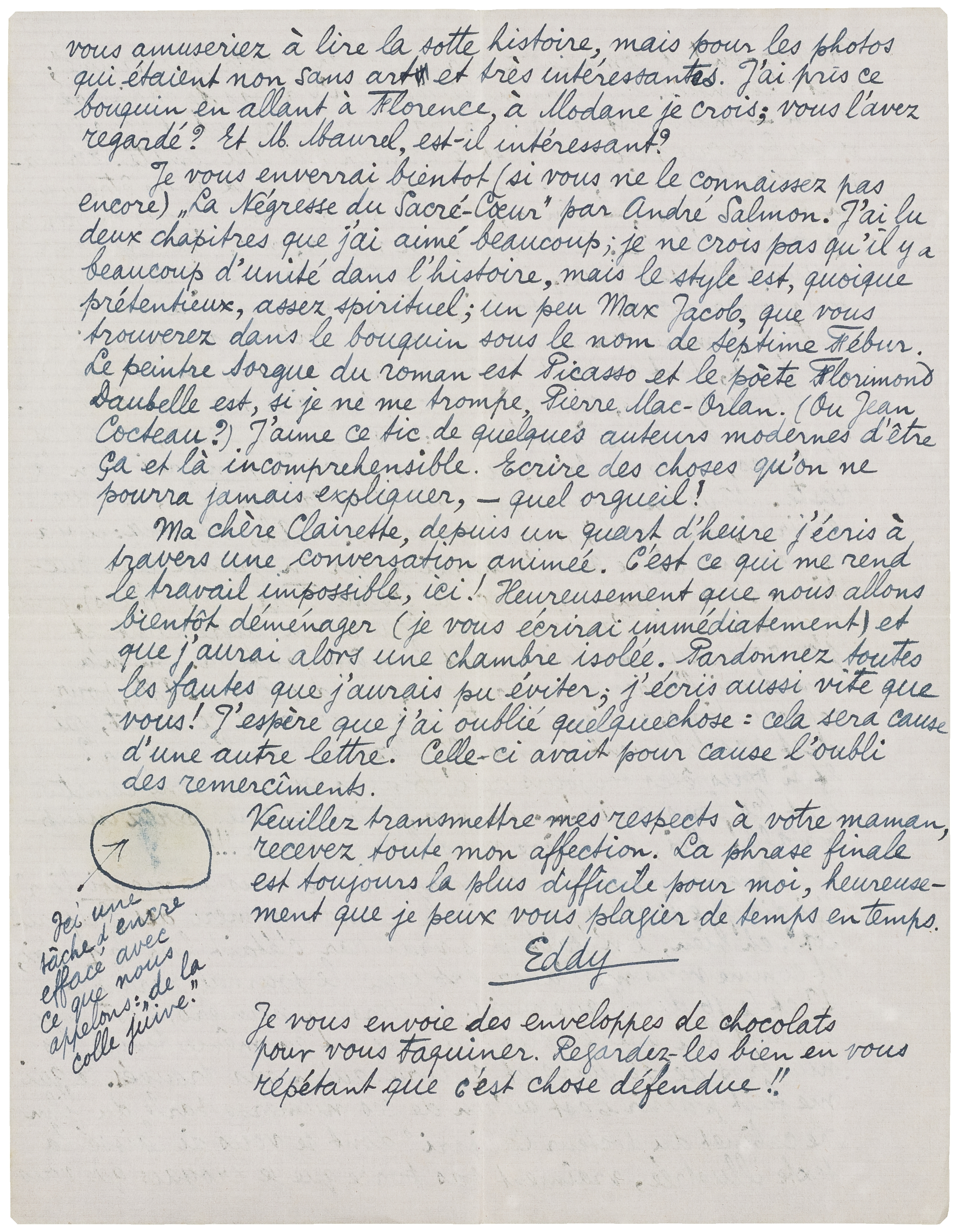 Je vous enverrai bientot (si vous ne le connaissez pas encore) La Négresse du Sacré-Coeur par André Salmon. J'ai lu deux chapitres que j'ai aimé beaucoup; je ne crois pas qu'il y a beaucoup d'unité dans l'histoire, mais le style est, quoique prétentieux, assez spirituel; un peu Max Jacob, que vous trouverez dans le bouquin sous le nom de Septime Fébur. Le peintre Sorgue du roman est Picasso et le poète Florimond Daubelle est, si je ne me trompe, Pierre Mac-Orlan. (Ou Jean Cocteau?) J'aime ce tic de quelques auteurs modernes d'être ça et là incomprehensible. Ecrire des choses qu'on ne pourra jamais expliquer, - quel orgueil!