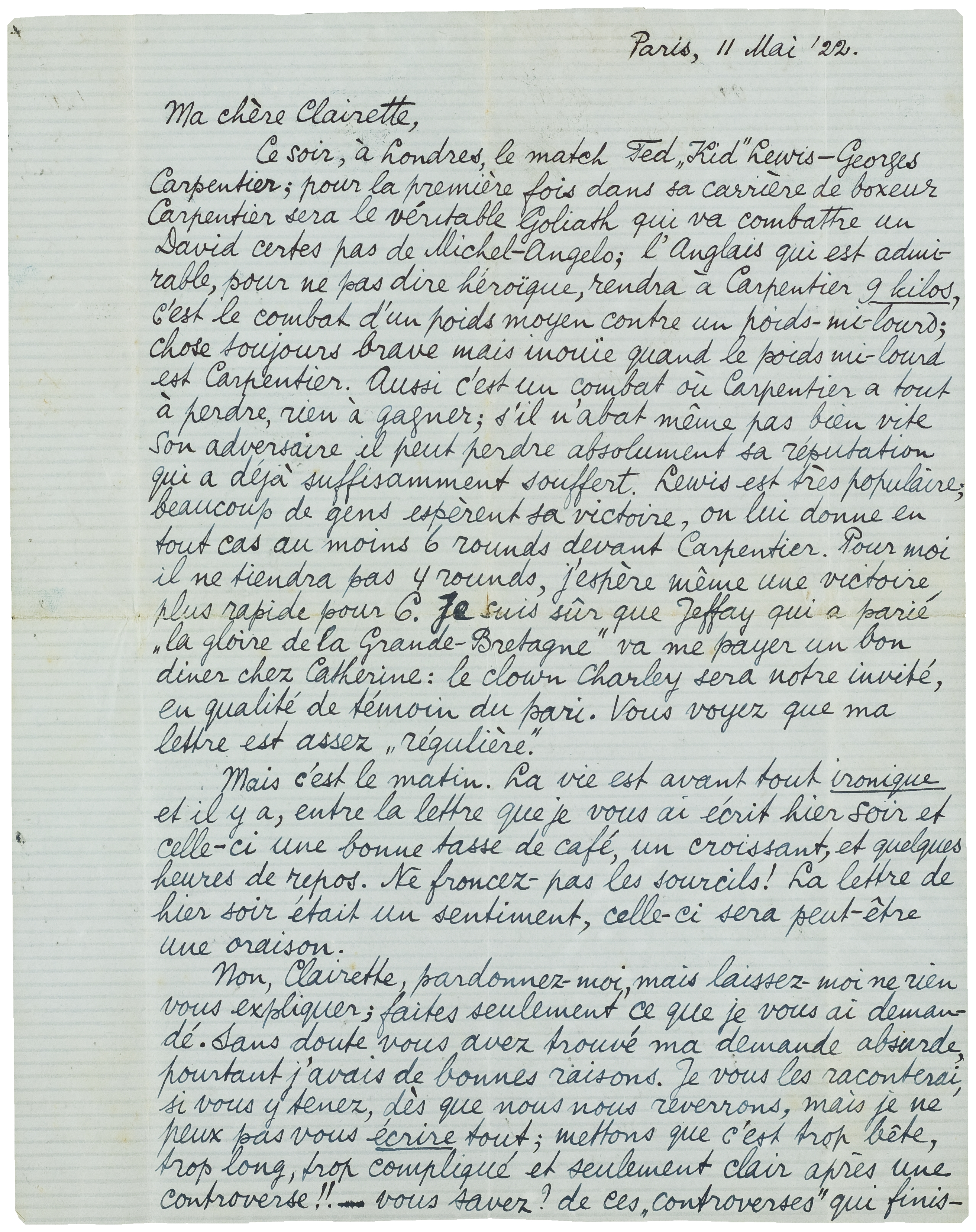 Ce soir, à Londres, le match Ted ‘Kid’ Lewis - Georges Carpentier; pour la première fois dans sa carrière de boxeur Carpentier sera le véritable Goliath qui va combattre un David certes pas de Michel-Angelo; l'Anglais qui est admirable, pour ne pas dire héroïque, rendra à Carpentier 9 kilos, c'est le combat d'un poids moyen contre un poids-mi-lourd; chose toujours brave mais inouïe quand le poids mi-lourd est Carpentier. Aussi c'est un combat où Carpentier a tout à perdre, rien à gagner; s'il n'abat même pas bien vite son adversaire il peut perdre absolument sa réputation qui a déjà suffisamment souffert. Lewis est très populaire; beaucoup de gens espèrent sa victoire, on lui donne en tout cas au moins 6 rounds devant Carpentier. Pour moi il ne tiendra pas 4 rounds, j'espère même une victoire plus rapide pour C. Je suis sûr que Jeffay qui a parié ‘la gloire de la Grande-Bretagne’ va me payer un bon diner chez Catherine: le clown Charley sera notre invité, en qualité de témoin du pari. Vous voyez que ma lettre est assez ‘régulière’.
