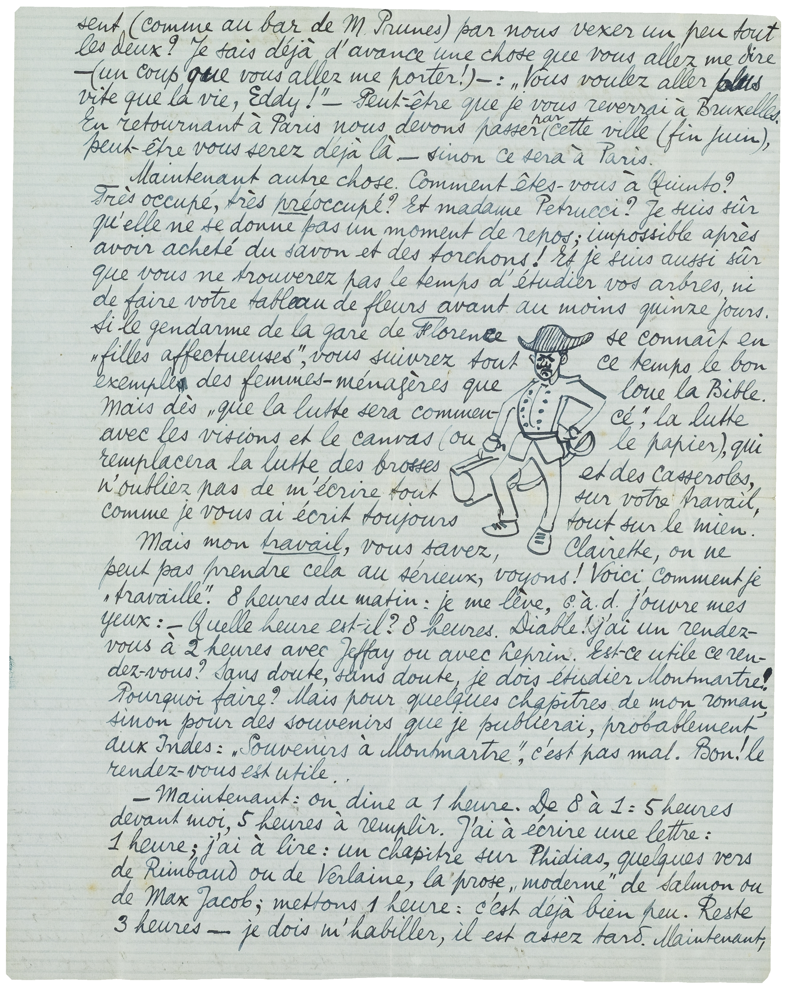 Mais mon travail, vous savez, Clairette, on ne peut pas prendre cela au sérieux, voyons! Voici comment je ‘travaille’. 8 heures du matin: je me lève, c.à.d. j'ouvre mes yeux: - Quelle heure est-il? 8 heures. Diable! j'ai un rendez-vous à 2 heures avec Jeffay ou avec Leprin. Est-ce utile ce rendez-vous? Sans doute, sans doute, je dois étudier Montmartre! Pourquoi faire? Mais pour quelques chapitres de mon roman, sinon pour des souvenirs que je publierai, probablement aux Indes: ‘Souvenirs à Montmartre’, c'est pas mal. Bon! le rendez-vous est utile.