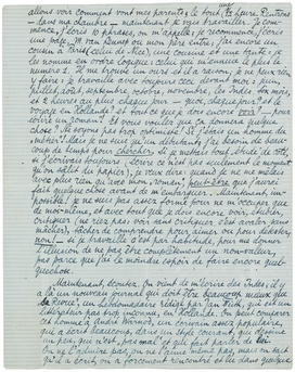- Maintenant: on dine a 1 heure. De 8 à 1: 5 heures devant moi, 5 heures à remplir. J'ai à écrire une lettre: 1 heure; j'ai à lire: un chapitre sur Phidias, quelques vers de Rimbaud ou de Verlaine, la prose ‘moderne’ de Salmon ou de Max Jacob; mettons 1 heure: c'est déjà bien peu. Reste 3 heures - je dois m'habiller, il est assez tard. Maintenant, allons voir comment vont mes parents; le tout (½ heure. Rentrons - dans ma chambre - maintenant je vais travailler. Je commence, j'écris 10 phrases, on m'appelle; je recommence, j'écris une page, M. van Lennep ou mon père entre; j'ai encore un cousin à Paris (celui de Nice), une cousine et une tante: je les nomme en ordre logique: celui qui m'ennuie le plus le numéro 1. Il me trouve un ours et il a raison; je ne peux rien y faire: je travaille avec toujours ceci devant moi: juin, juillet, août, septembre, octobre, novembre, les Indes. Six mois, et 2 heures au plus chaque jour - quoi, chaque jour? et le voyage en Hollande? et tout ce que je dois encore voir? - pour écrire un ‘roman’! Et vous voulez que ça donnera quelque chose? Ne soyons pas trop optimiste! Si j'étais un homme du ‘métier’! Mais je ne suis qu'un débutant; j'ai besoin de beaucoup de temps pour chercher. Si je mettais tout ‘étude’ de côté, si j'écrivais toujours (écrire ce n'est pas seulement le moment qu'on sâlit du papier), je veux dire: quand je ne me mêlais avec plus rien qu'avec mon ‘roman’, peut-être que j'aurai fait quelque chose avant de m'embarquer. Maintenant, impossible! je ne suis pas assez formé pour ne m'occuper que de moi-même, et avec tout que je dois encore voir, étudier, critiquer (ne riez pas: voir sans critiquer, c'est avaler sans mâcher), tâcher de comprendre pour aimer ou pour détester, non! - si je travaille c'est par habitude, pour me donner l'illusion de ne pas être complètement un non-valeur, pas parce que j'ai le moindre espoir de faire encore quelquechose.