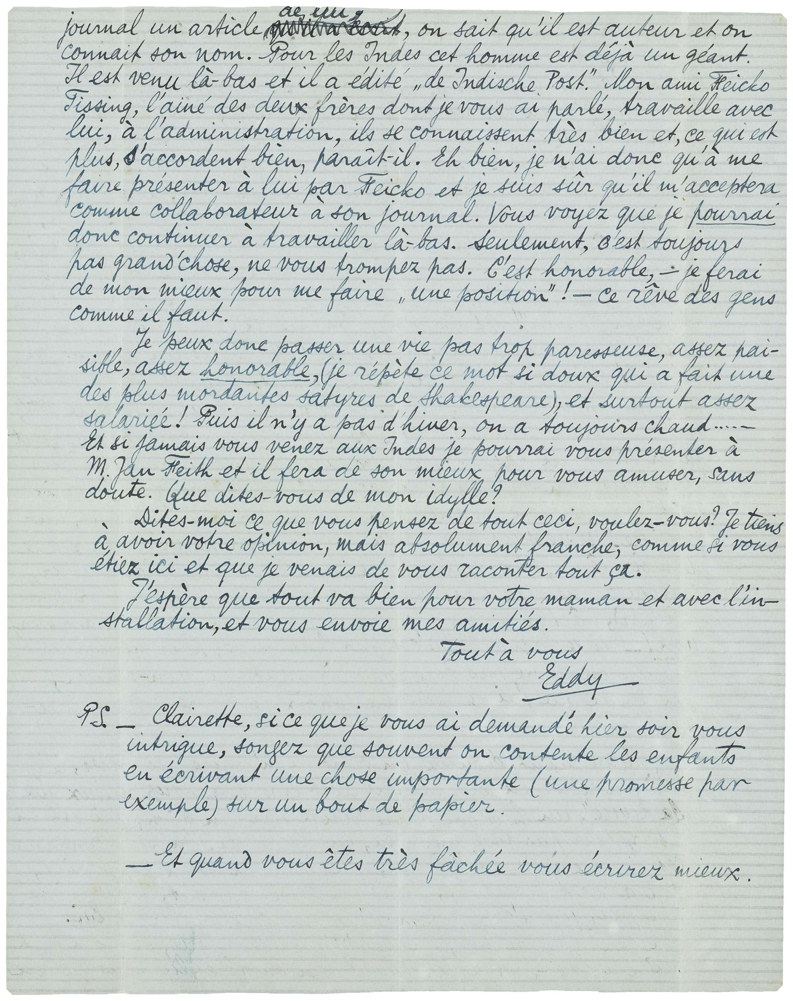 Maintenant, écoutez. On vient de m'écrire des Indes; il y a là un nouveau journal qui doit être beaucoup mieux que De Revue, un hebdomadaire rédigé par Jan Feith, qui est un littérateur pas trop inconnu, en Hollande. On peut comparer cet homme à André Warnod, un écrivain assez populaire, qui a écrit beaucoup, dans un style courant, qui dessine un peu, qui n'est ‘pas mal’ et qui fait parler de lui. On ne l'admire pas, on ne l'aime même pas, mais on sait qu'il a écrit, on a forcément rencontré et lu dans quelque journal un article, on sait qu'il est auteur et on connait son nom. Pour les Indes cet homme est déjà un géant. Il est venu là-bas et il a édité De Indische Post. Mon ami Feicko Tissing, l'ainé des deux frères dont je vous ai parlé, travaille avec lui, à l'administration, ils se connaissent très bien et, ce qui est plus, s'accordent bien, paraît-il. Eh bien, je n'ai donc qu'à me faire présenter à lui par Feicko et je suis sûr qu'il m'acceptera comme collaborateur à son journal. Vous voyez que je pourrai donc continuer à travailler là-bas. Seulement, c'est toujours pas grand'chose, ne vous trompez pas. C'est honorable, - je ferai de mon mieux pour me faire ‘une position’! - ce rêve des gens comme il faut.