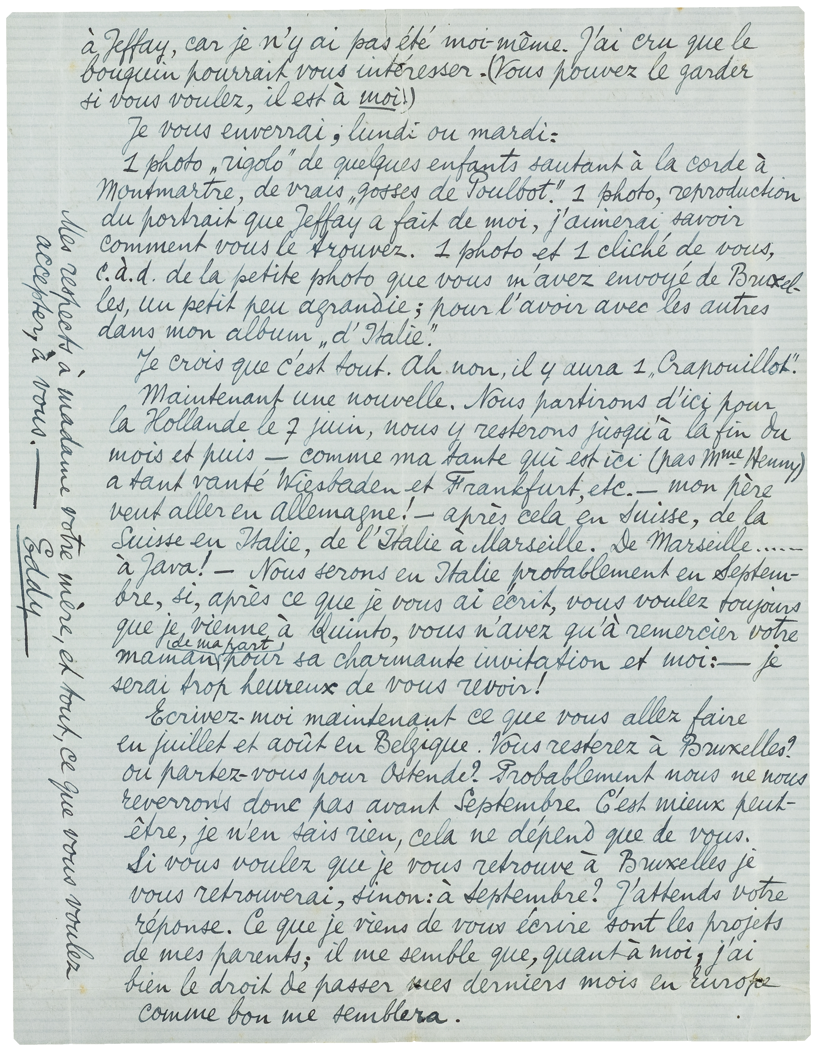 Ecrivez-moi maintenant ce que vous allez faire en juillet et août en Belgique. Vous resterez à Bruxelles? ou partez-vous pour Ostende? Probablement nous ne nous reverrons donc pas avant Septembre. C'est mieux peut-être, je n'en sais rien, cela ne dépend que de vous. Si vous voulez que je vous retrouve à Bruxelles je vous retrouverai, sinon: à Septembre? J'attends votre réponse. Ce que je viens de vous écrire sont les projets de mes parents; il me semble que, quant à moi, j'ai bien le droit de passer mes derniers mois en Europe comme bon me semblera.