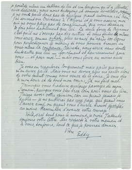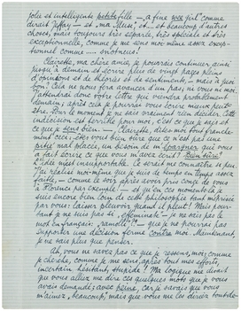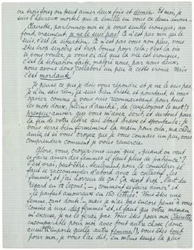 Je pense que je dois vous répondre et je ne le sais pas. Je n'en sais rien, je suis bien triste et pourtant, si vous saviez comme je vous suis reconnaissant pour tout les mots doux, pleins d'amitié, de (employons le mot!) presque-amour que vous m'avez écrit, et surtout pour la fin de votre lettre qui était brave et spontanée; je vous serre bien fermement la main pour cela, ma chère amie, et si vous croyez que je vous connais un peu, vous comprendrez comment je vous remercie.