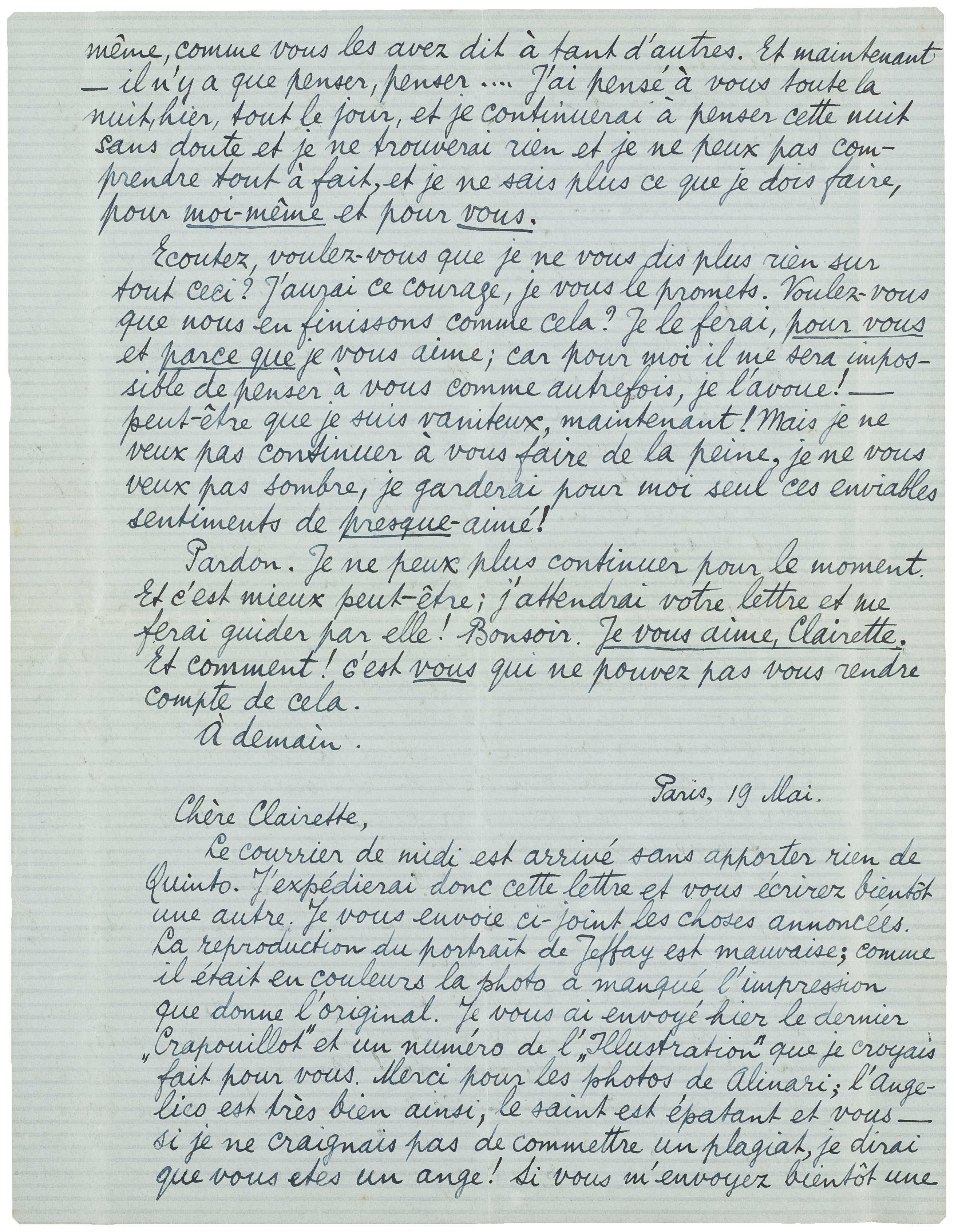 Pardon. Je ne peux plus continuer pour le moment. Et c'est mieux peut-être; j'attendrai votre lettre et me ferai guider par elle! Bonsoir. Je vous aime, Clairette. Et comment! c'est vous_qui ne pouvez pas vous rendre compte de cela.