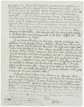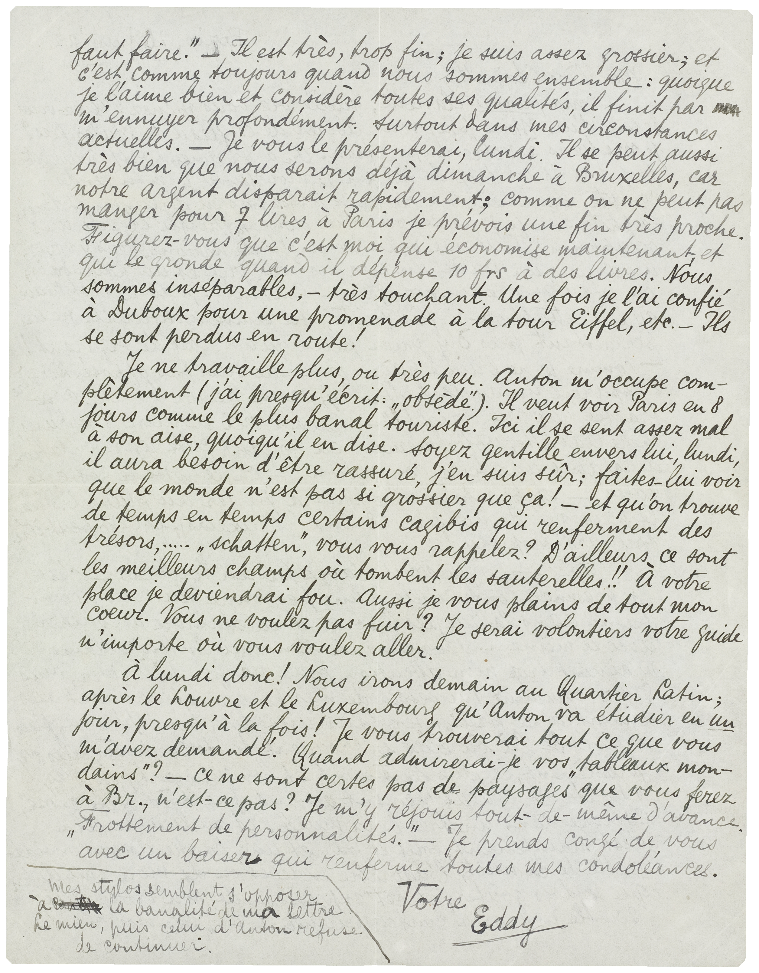 Puis: - ce que vous n'avez pas en tout cas - c'est la présence continuelle d'une personne qui vous accompagne dans la rue, les bistros et la chambre à coucher avec le même.... dévouement. Mon ami Anton réclame vraiment trop mon attention pour ne pas m'irriter, vous savez combien j'ai besoin de mes pensées et comment elles aiment à se précipiter dans une direction spéciale, puis, arrivés là où elles se trouvent toutes contentes, elles s'y promènent, le plus lentement et longuement possibles, s'arrêtant chaque moment devant une très belle chose, comme dans un très beau musée. Et au lieu de cela c'est maintenant tout le jour et une partie assez considérable de la nuit, l'adorable indécision de mon ami Anton que je dois goûter, et cet expression de son visage qui semble implorer continuellement: - ‘Dis-moi ce qu'il faut faire.’ - Il est très, trop fin; je suis assez grossier; et c'est comme toujours quand nous sommes ensemble: quoique je l'aime bien et considère toutes ses qualités, il finit par m'ennuyer profondément surtout dans mes circonstances actuelles. - Je vous le présenterai, lundi. Il se peut aussi très bien que nous serons déjà dimanche à Bruxelles, car notre argent disparait rapidement; comme on ne peut pas manger pour 7 lires à Paris je prévois une fin très proche. Figurez-vous que c'est moi qui économise maintenant, et qui le gronde quand il dépense 10 frs à des livres. Nous sommes inséparables, - très touchant. Une fois je l'ai confié à Duboux pour une promenade à la tour Eiffel, etc. - Ils se sont perdus en route!