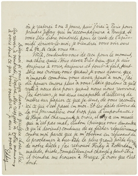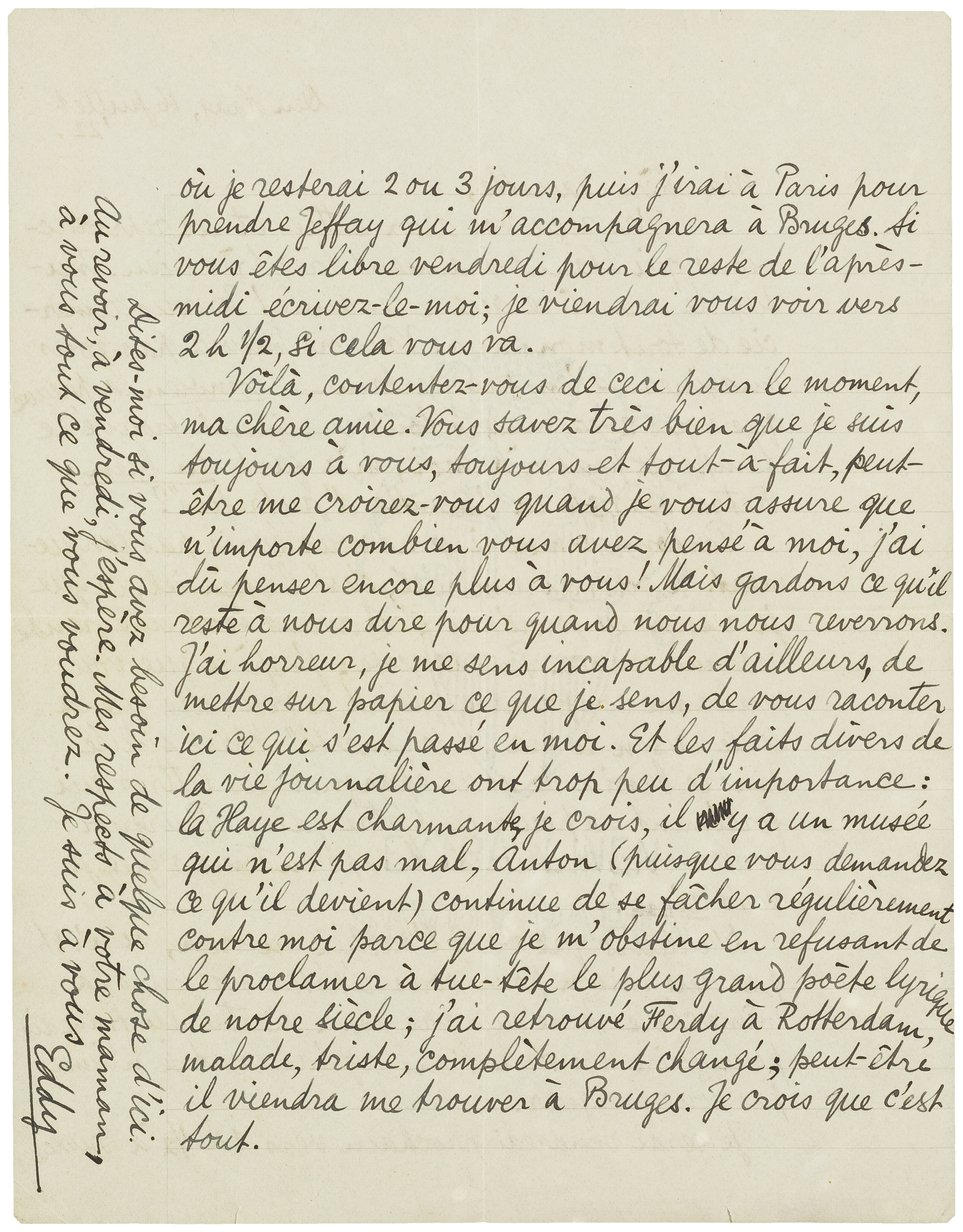 Je serai vendredi prochain vers 1h.½ à Bruxelles où je resterai 2 ou 3 jours, puis j'irai à Paris pour prendre Jeffay qui m'accompagnera à Bruges. Si vous êtes libre vendredi pour le reste de l'après-midi écrivez-le-moi; je viendrai vous voir vers 2h½, si cela vous va.