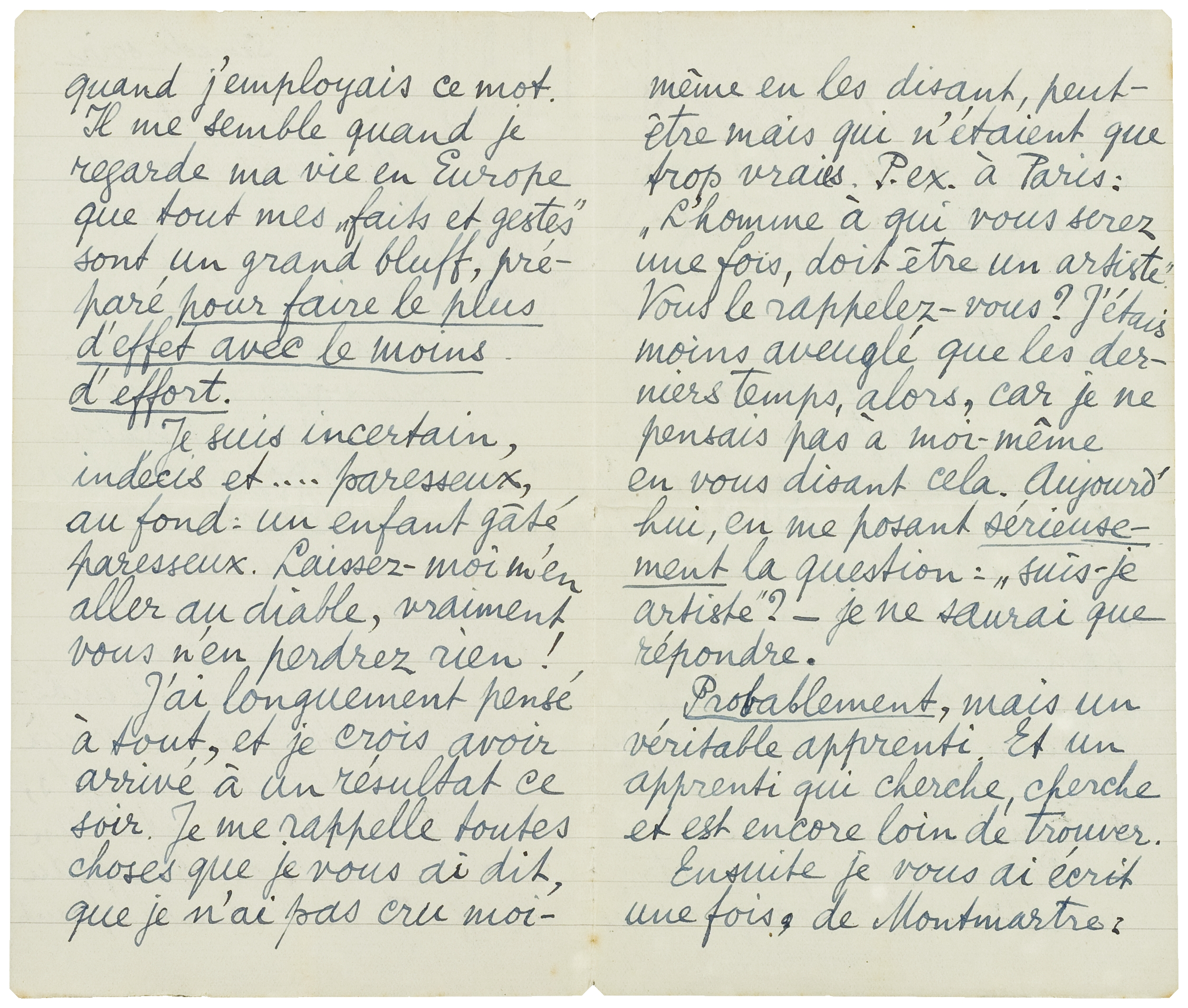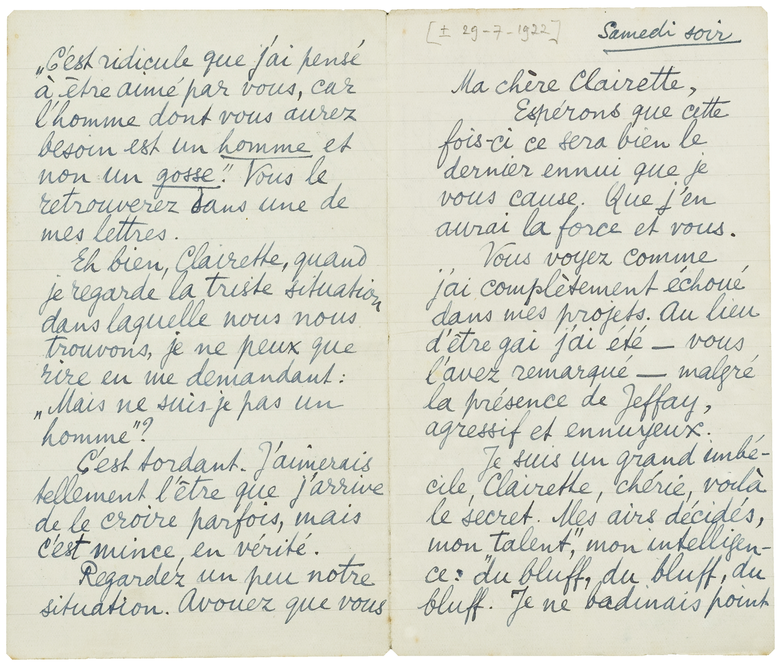 Je suis un grand imbécile, Clairette, chérie, voilà le secret. Mes airs décidés, mon ‘talent’, mon intelligence: du bluff, du bluff, du bluff. Je ne badinais point quand j'employais ce mot. Il me semble quand je regarde ma vie en Europe que tout mes ‘faits et gestes’ sont un grand bluff, préparé pour faire le plus d'effet avec le moins d'effort.