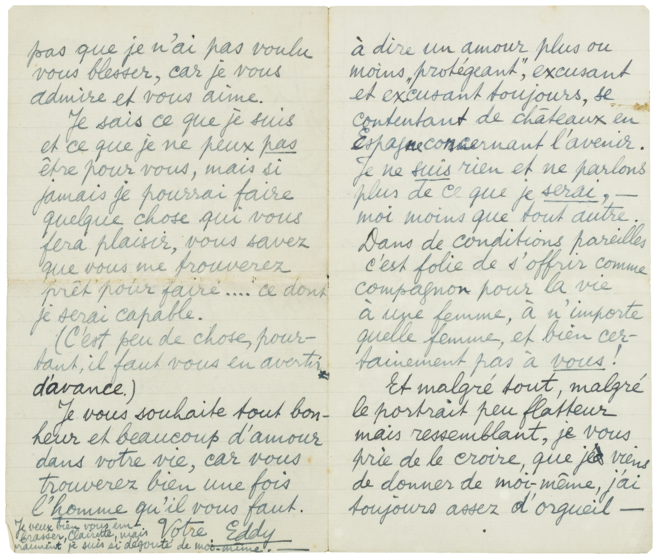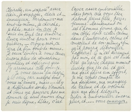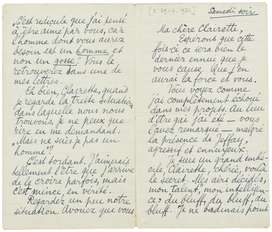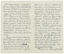 Ecoutez, ma chère amie, vous ne me voulez pas n'est ce pas de vous avoir écrit comme j'ai fait. C'était impossible pour moi de vous le cacher plus longtemps, Jeffay sera là demain, je ne pourrai vous parler. Avant de partir pour tout de bon je vous reverrai j'espère. Je n'ai qu'à vous remercier pour tout ce que vous m'avez donné. Faut-il vous demander encore une fois pardon? C'est si banal, si ‘fin de billets doux’. Vous savez n'est ce pas que je n'ai pas voulu vous blesser, car je vous admire et vous aime.