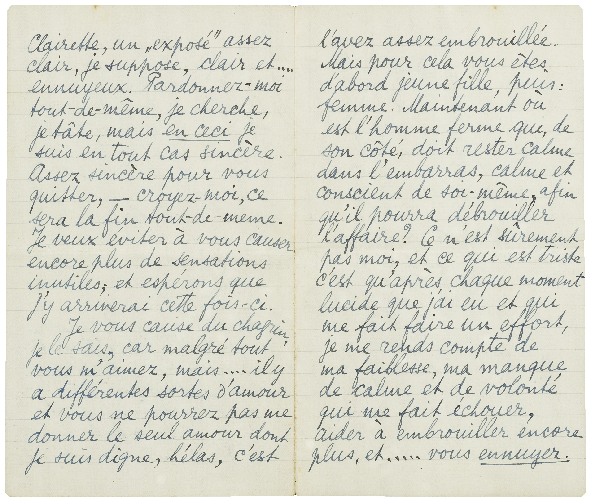 Voilà, ma chère grande Clairette, un ‘exposé’ assez clair, je suppose, clair et.... ennuyeux. Pardonnez-moi tout-de-même, je cherche, je tâte, mais en ceci je suis en tout cas sincère. Assez sincère pour vous quitter, - croyez-moi, ce sera la fin tout-de-meme. Je veux éviter à vous causer encore plus de sensations inutiles; et espèrons que j'y arriverai cette fois-ci.