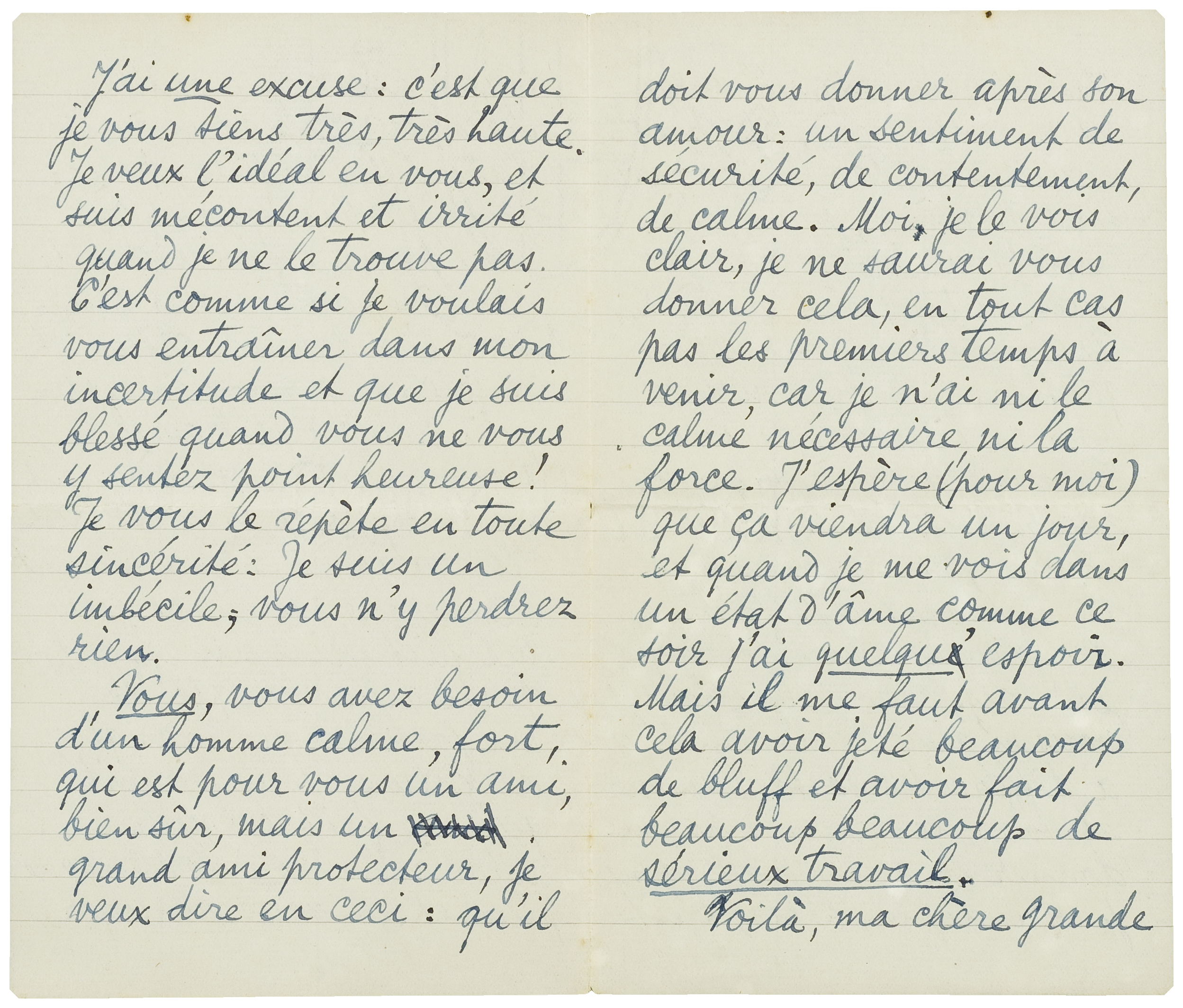 Vous, vous avez besoin d'un homme calme, fort, qui est pour vous un ami, bien sûr, mais un grand ami protecteur, je veux dire en ceci: qu'il doit vous donner après son amour: un sentiment de sécurité, de contentement, de calme. Moi, je le vois clair, je ne saurai vous donner cela, en tout cas pas les premiers temps à venir, car je n'ai ni le calme nécessaire, ni la force. J'espère (pour moi) que ça viendra un jour, et quand je me vois dans un état d'âme comme ce soir j'ai quelqu'espoir. Mais il me faut avant cela avoir jeté beaucoup de bluff et avoir fait beaucoup beaucoup de sérieux travail.