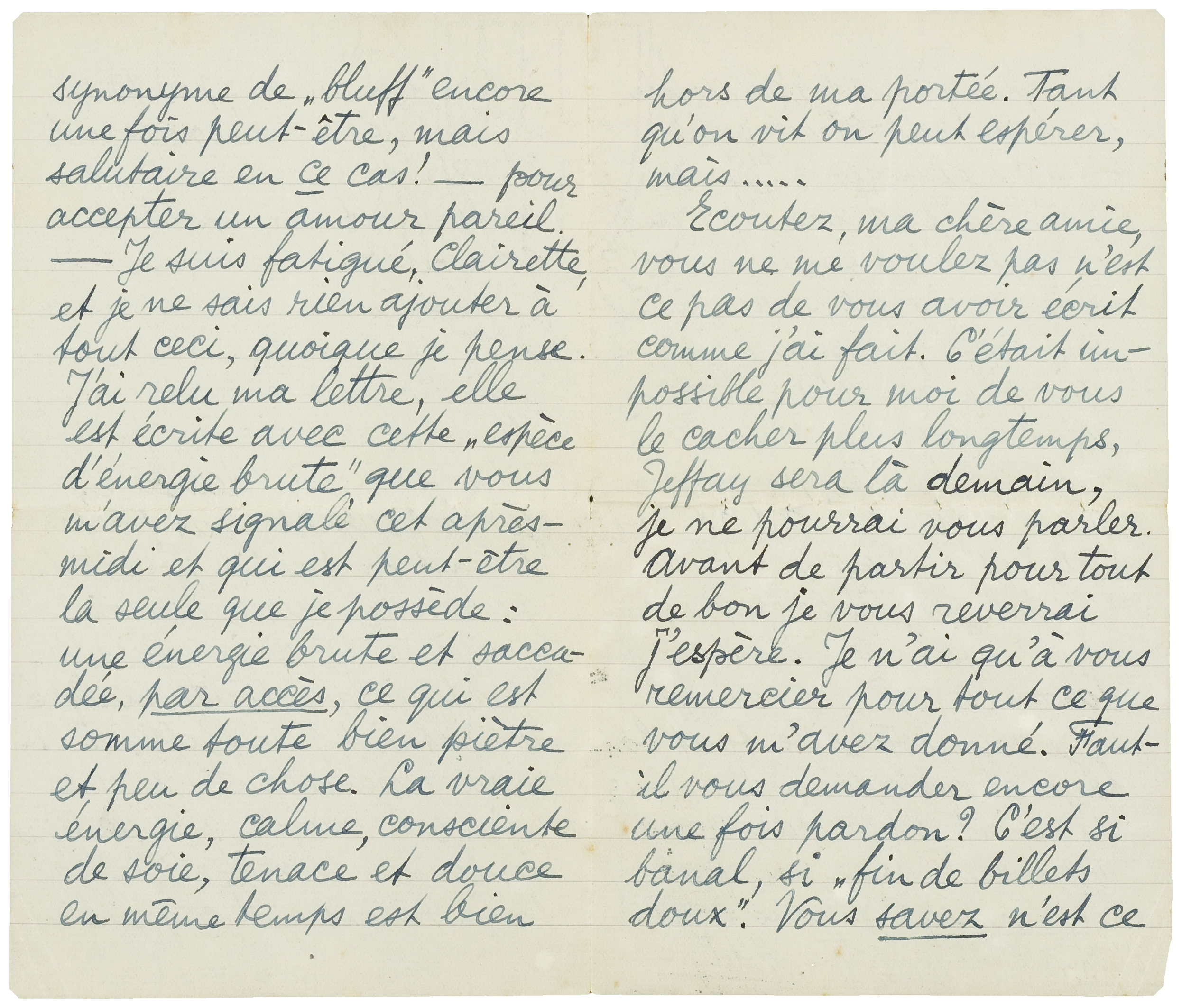 Et malgré tout, malgré le portrait peu flatteur mais ressemblant, je vous prie de le croire, que je viens de donner de moi-même, j'ai toujours assez d'orgueil - synonyme de ‘bluff’ encore une fois peut-être, mais salutaire en ce cas! - pour accepter un amour pareil. - Je suis fatigué, Clairette, et je ne sais rien ajouter à tout ceci, quoique je pense. J'ai relu ma lettre, elle est écrite avec cette ‘espèce d'énergie brute’ que vous m'avez signalé cet après-midi et qui est peut-être la seule que je possède: une énergie brute et saccadée, par accès, ce qui est somme toute bien piètre et peu de chose. La vraie énergie, calme, consciente de soie, tenace et douce en même temps est bien hors de ma portée. Tant qu'on vit on peut espérer, mais.....