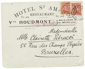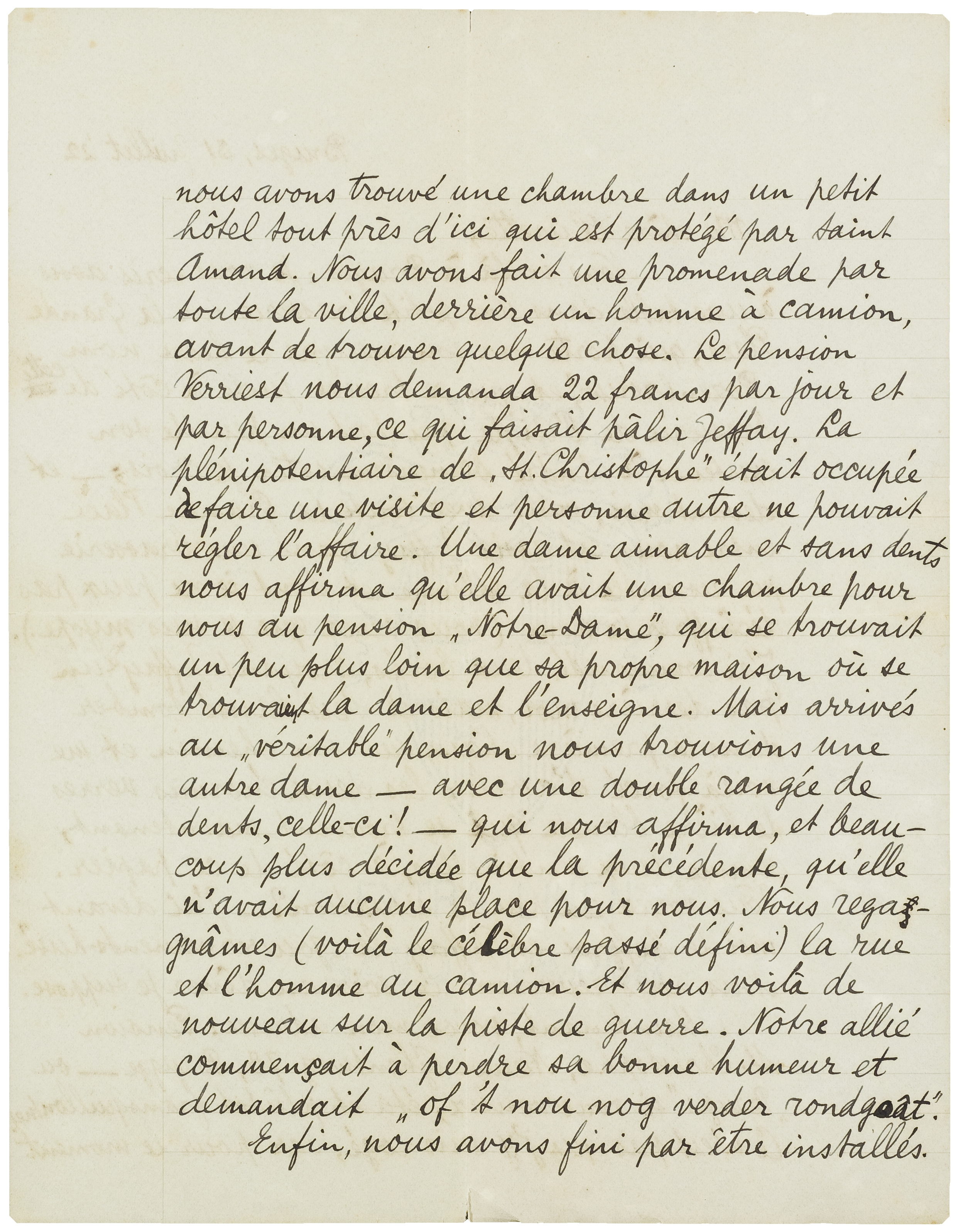 Maintenant, voici mon adresse: Pension St. Christophe, Nieuwe Ghentweg 78, Brugge - ou ‘Bruges’ si vous voulez, étant plûtot fransquillon(ne). Ce n'est pas que j'y suis logé, car pour le moment nous avons trouvé une chambre dans un petit hôtel tout près d'ici qui est protégé par Saint Amand. Nous avons fait une promenade par toute la ville, derrière un homme à camion, avant de trouver quelque chose. Le pension Verriest nous demanda 22 francs par jours et par personne, ce qui faisait pâlir Jeffay. La plénipotentiaire de ‘St. Christophe’ était occupée de faire une visite et personne autre ne pouvait régler l'affaire. Une dame aimable et sans dents nous affirma qu'elle avait une chambre pour nous au pension ‘Notre-Dame’, qui se trouvait un peu plus loin que sa propre maison où se trouvait la dame et l'enseigne. Mais arrivés au ‘véritable’ pension nous trouvions une autre dame - avec une double rangée de dents, celle-ci! - qui nous affirma, et beaucoup plus décidée que la précédente, qu'elle n'avait aucune place pour nous. Nous regagnâmes (voilà le célèbre passé défini) la rue et l'homme au camion. Et nous voilà de nouveau sur la piste de guerre. Notre allié commençait à perdre sa bonne humeur et demandait ‘of ‘t nou nog verder rondgoât’.