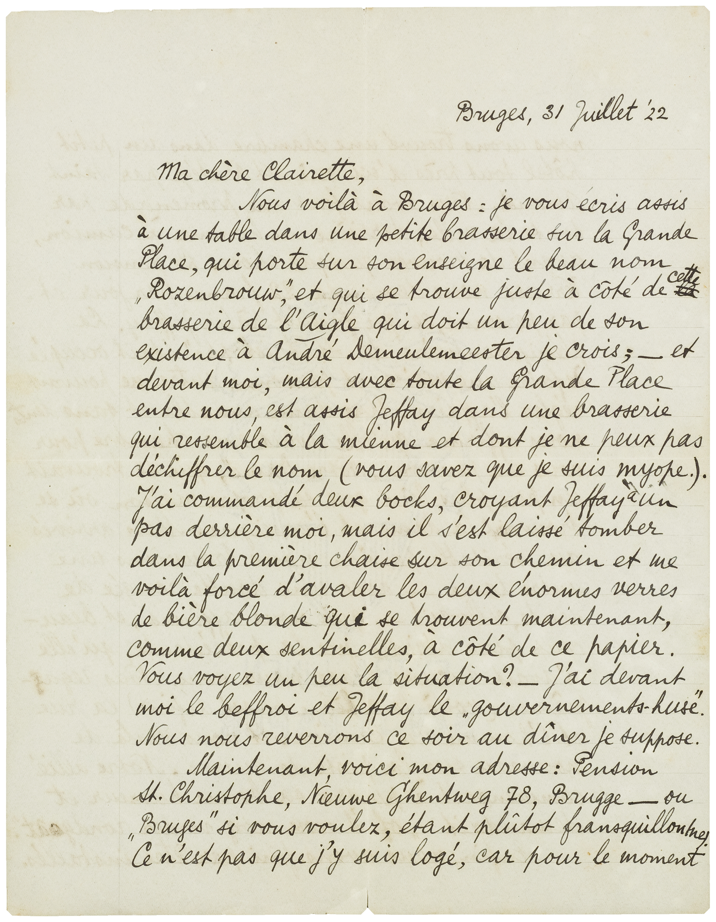 Nous voilà à Bruges: je vous écris assis à une table dans une petite brasserie sur la Grande Place, qui porte sur son enseigne le beau nom ‘Rozenbrouw’, et qui se trouve juste à côté de cette brasserie de l'Aigle qui doit un peu de son existence à André Demeulemeester je crois; - et devant moi, mais avec toute la Grande Place entre nous, est assis Jeffay dans une brasserie qui ressemble à la mienne et dont je ne peux pas déchiffrer le nom (vous savez que je suis myope.). J'ai commandé deux bocks, croyant Jeffay à un pas derrière moi, mais il s'est laissé tomber dans la première chaise sur son chemin et me voilà forcé d'avaler les deux énormes verres de bière blonde qui se trouvent maintenant, comme deux sentinelles, à côté de ce papier. Vous voyez un peu la situation? - J'ai devant moi le beffroi et Jeffay le ‘gouvernements-huse’. Nous nous reverrons ce soir au dîner je suppose.