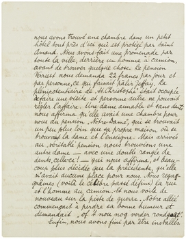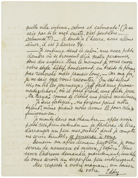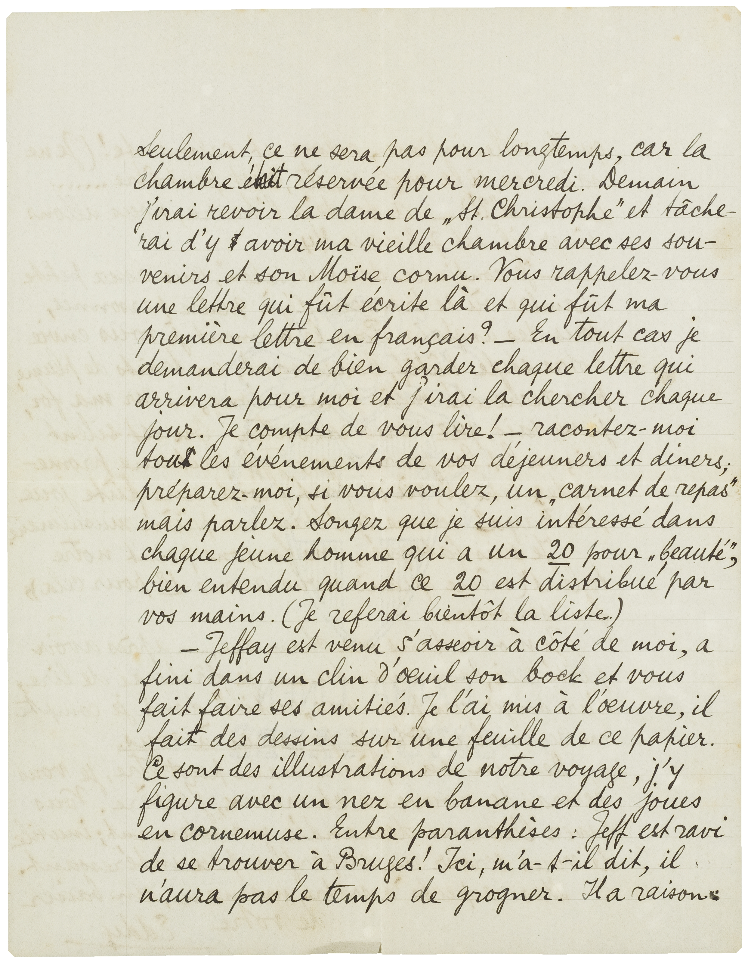 Enfin, nous avons fini par être installés. Seulement, ce ne sera pas pour longtemps, car la chambre était réservée pour mercredi. Demain j'irai revoir la dame de ‘St Christophe’ et tâcherai d'y avoir ma vieille chambre avec ses souvenirs et son Moïse cornu. Vous rappelez-vous une lettre qui fût écrite là et qui fût ma première lettre en français? - En tout cas je demanderai de bien garder chaque lettre qui arrivera pour moi et j'irai la chercher chaque jour. Je compte de vous lire! - racontez-moi tous les événements de vos déjeuners et diners; préparez-moi, si vous voulez, un ‘carnet de repas’ mais parlez. Songez que je suis intéressé dans chaque jeune homme qui a un 20 pour ‘beauté’, bien entendu quand ce 20 est distribué par vos mains. (Je referai bientôt la liste.)