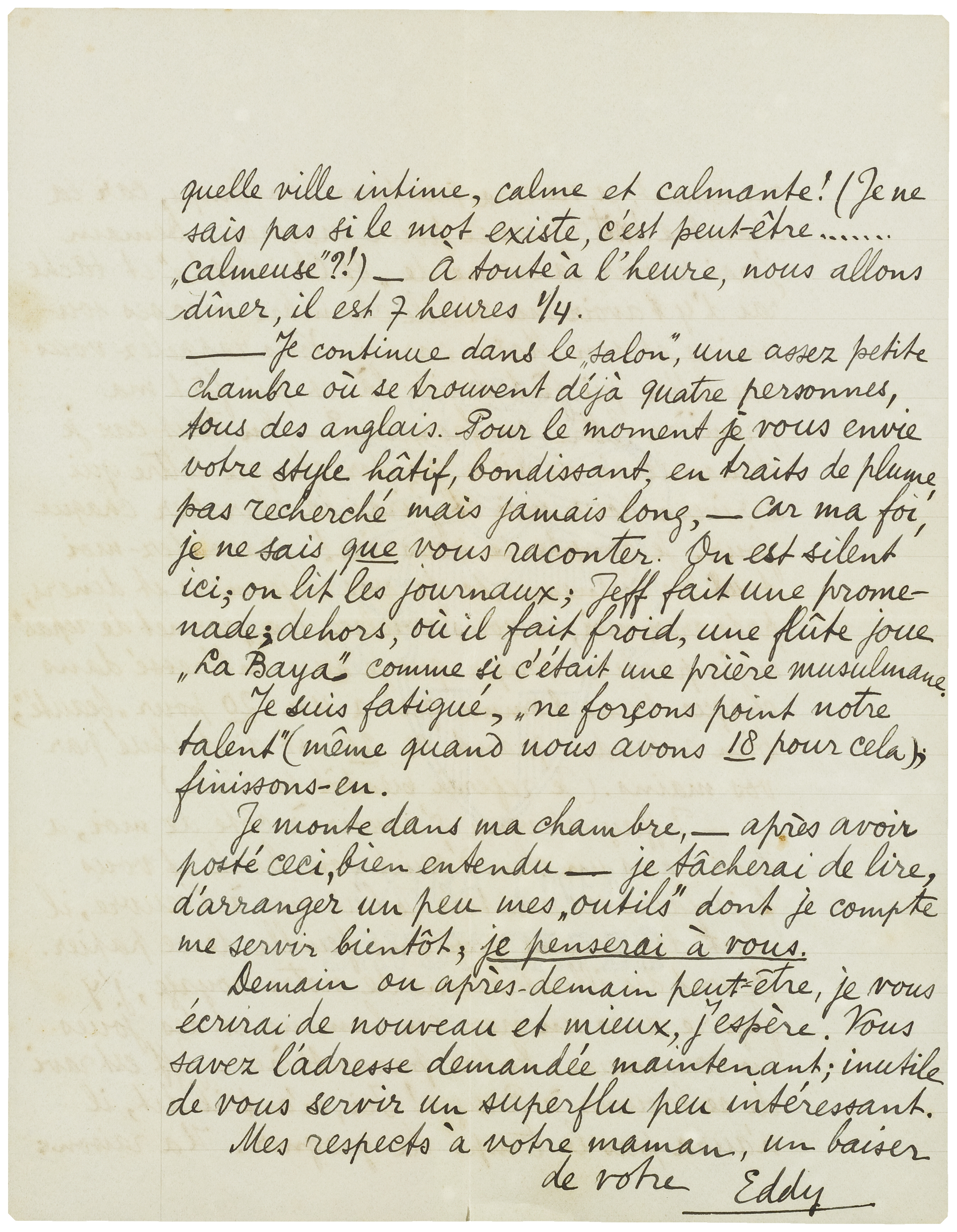 - Je continue dans le ‘salon’, une assez petite chambre où se trouvent déjà quatre personnes, tous des anglais. Pour le moment je vous envie votre style hâtif, bondissant, en traits de plume, pas recherché mais jamais long, - car ma foi, je ne sais que vous raconter. On est silent ici, on lit les journaux; Jeff fait une promenade; dehors, où il fait froid, une flûte joue ‘La Baya’ comme si c'était une prière musulmane.