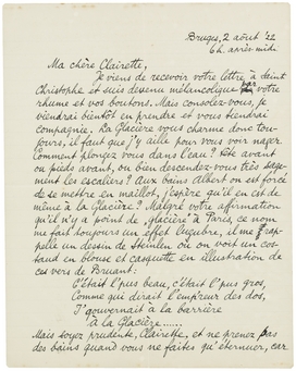 - Après avoir reçu votre lettre j'ai fait du canotage et me suis aperçu que je ne sais pas ramer et diriger à la fois selon la méthode européenne; je me suis retourné donc sur mon banc (?) et ai pagayé (?) Jeffay rame assez bien et ainsi monsieur Také Sato qui est en train de devenir ‘amis’ avec nous. Demain nous irons peut-être tous les trois à Ostende. Sato a une méthode curieuse de peindre, je vous ai dit qu'il est peintre sur soie; eh bien, il fait des dessins avec crayon dans la rue et les travaille ensuite dans sa chambre, car il travaille avec des couleurs japonaises qu'il mélange avec du gélatine; il a devant lui tout un régiment de petits pots émaillés et une bougie brûlante qui lui sert de chauffer ses mixtures. Il donne des vêtements bruns, rouges et bleus aux petites poupées qu'il a dessiné dans ses paysages, avec la conscience charmante d'un enfant. Vous seriez ravie de le voir à l'oeuvre, Clairetty!