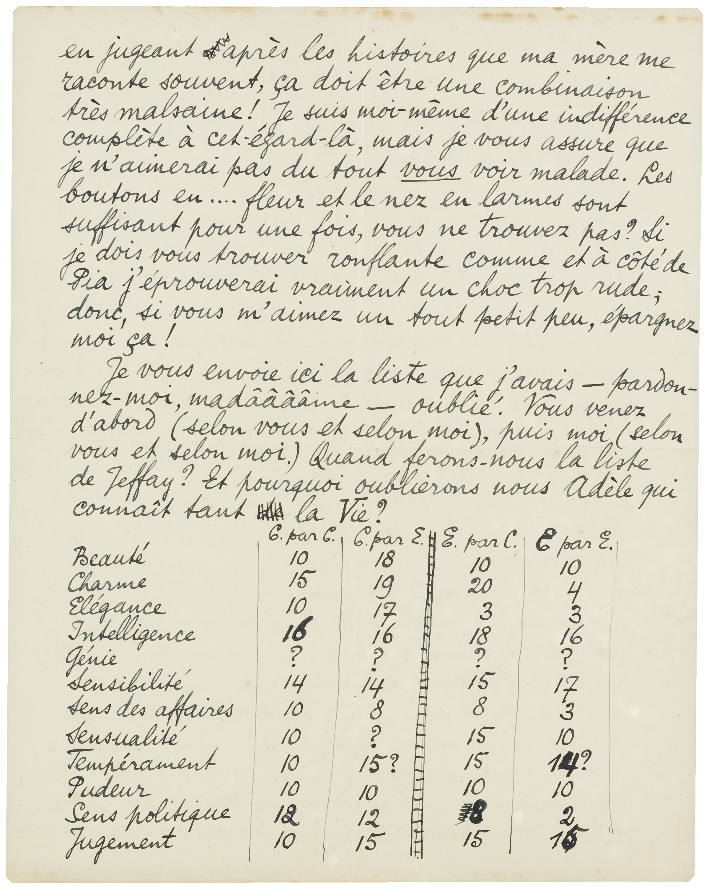 Je vous envoie ici la liste que j'avais- pardonnez-moi, madââââme - oublié. Vous venez d'abord (selon vous et selon moi), puis moi (selon vous et selon moi). Quand ferons-nous la liste de Jeffay? Et pourquoi oublierons nous Adèle qui connaît tant la Vie?