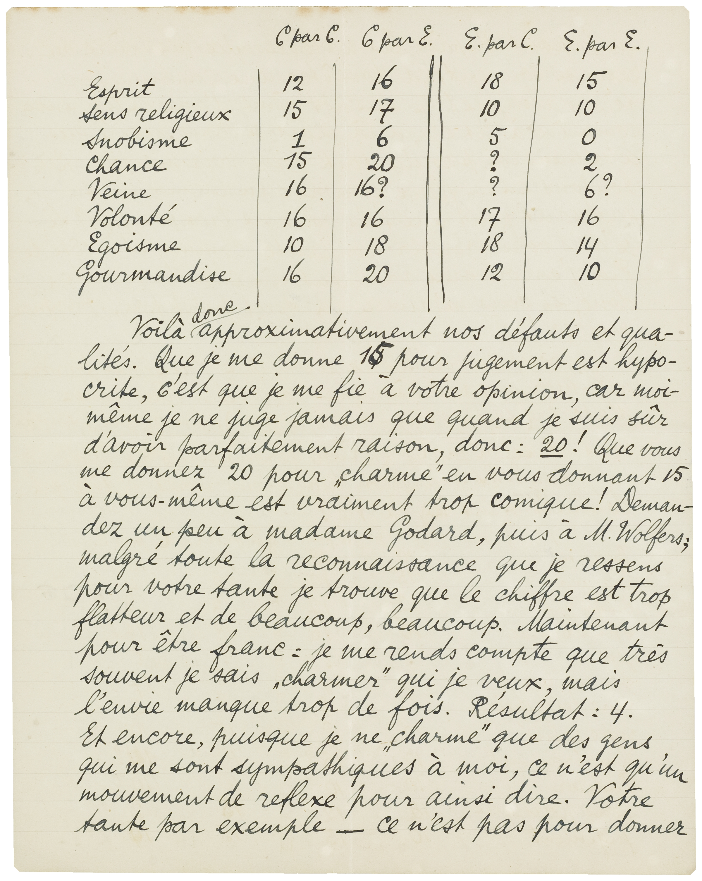 Voilà donc approximativement vos défauts et qualités. Que je me donne 15 pour jugement est hypocrite, c'est que je me fie à votre opinion, car moi-même je ne juge jamais que quand je suis sûr d'avoir parfaitement raison, donc: 20! Que vous me donnez 20 pour ‘charme’ en vous donnant 15 à vous-même est vraiment trop comique! Demandez un peu à madame Godard, puis à M. Wolfers; malgré toute la reconnaissance que je ressens pour votre tante je trouve que le chiffre est trop flatteur et de beaucoup, beaucoup. Maintenant pour être franc: je me rends compte que très souvent je sais ‘charmer’ qui je veux, mais l'envie manque trop de fois. Résultat: 4. Et encore, puisque je ne ‘charme’ que des gens qui me sont sympathiques à moi, ce n'est qu'un mouvement de reflexe pour ainsi dire. Votre tante par exemple - ce n'est pas pour donner ‘galanterie pour galanterie’ - m'est extrêmement sympathique; votre amie Jedda me donne (pour ne pas dire ‘la peau de chat’ que je vous laisse pour mesdames Scholder, Samuel, etc.) les plis de bouledogue (Voire Pia.) Son mari qui me fait toujours penser à une statue en terre tombé sur son profil, m'est, par ce fait déjà, beaucoup plus sympathique. - A vous de combiner.