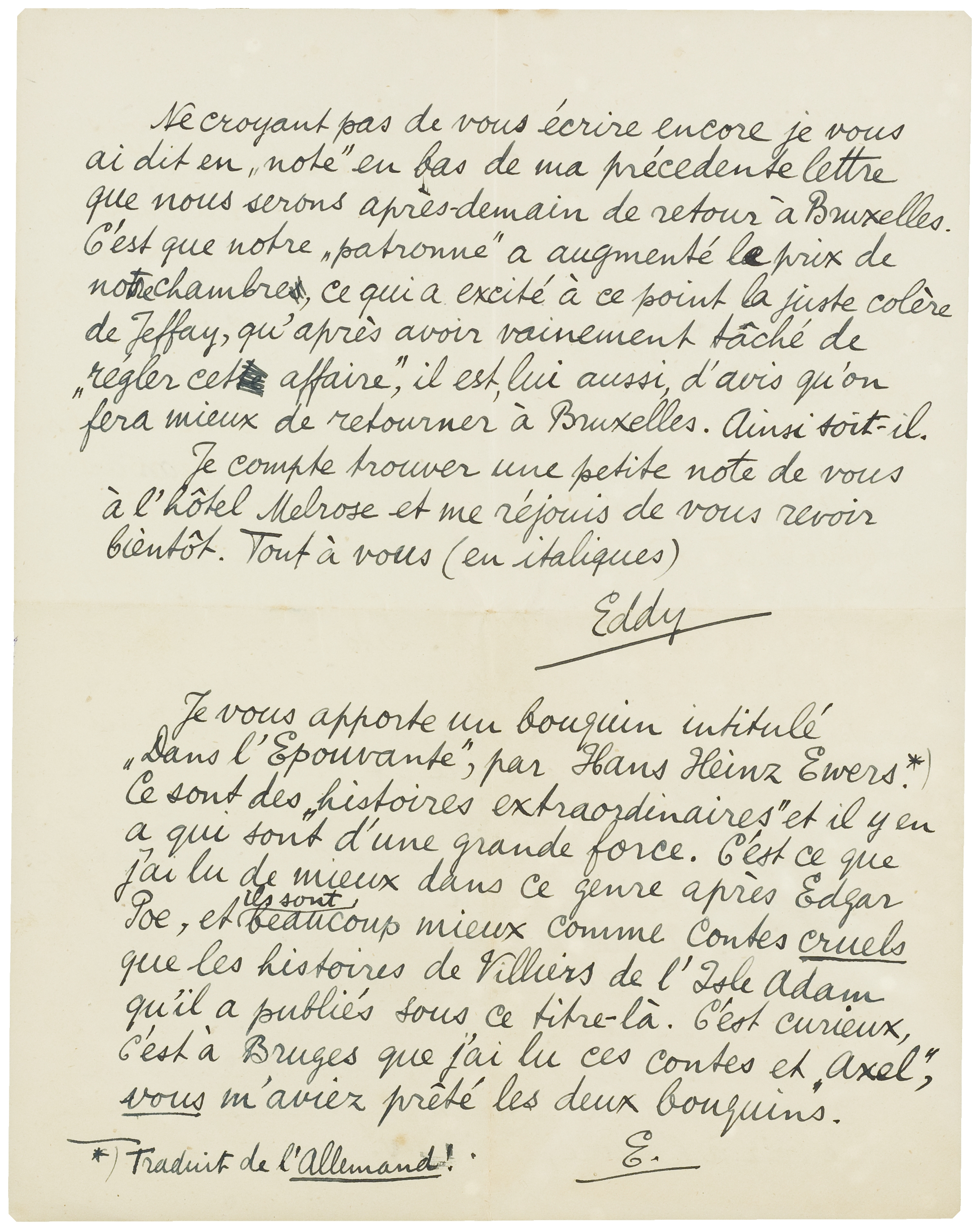 Je vous apporte un bouquin intitulé Dans l'Epouvante, par Hans Heinz Ewers.* Ce sont des ‘histoires extraordinaires’ et il y en a qui sont d'une grande force. C'est ce que j'ai lu de mieux dans ce genre après Edgar Poe, et ils sont mieux comme contes cruels que les histoires de Villiers de l'Isle Adam qu'il a publié sous ce titre-là. C'est curieux, c'est à Bruges que j'ai lu ces contes et Axel, vous m'aviez prêté les deux bouquins.